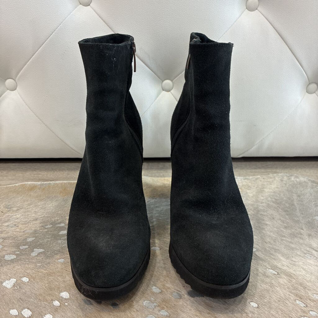 Step out in effortless style with these La Canadienne Myranda Black Suede Waterproof Platform Boots. Gently preloved and well cared for, these dressy ankle boots combine elegance with everyday practicality. They feature a round toe, side zip closure, and a high heel wedge that offers flattering height with added stability.