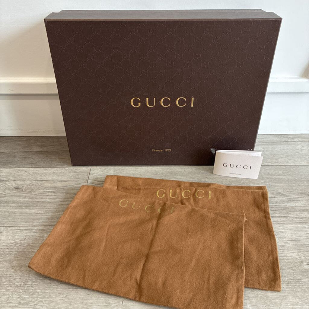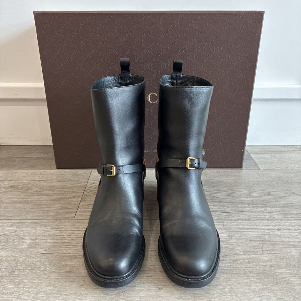 The boots are in excellent pre-loved condition, appearing to have been worn only once. The upper leather is pristine with no visible scuffs, and there is only very light wear to the soles, consistent with minimal use. Fully lined in leather with a leather sole, they reflect Gucci’s exceptional craftsmanship and attention to detail.