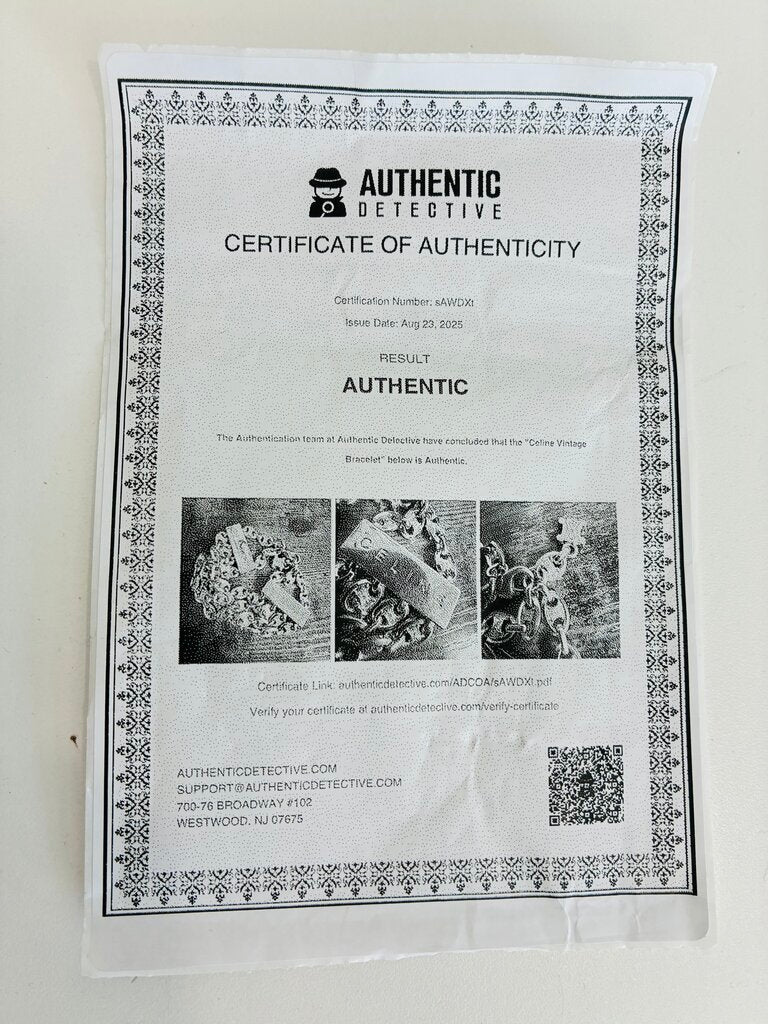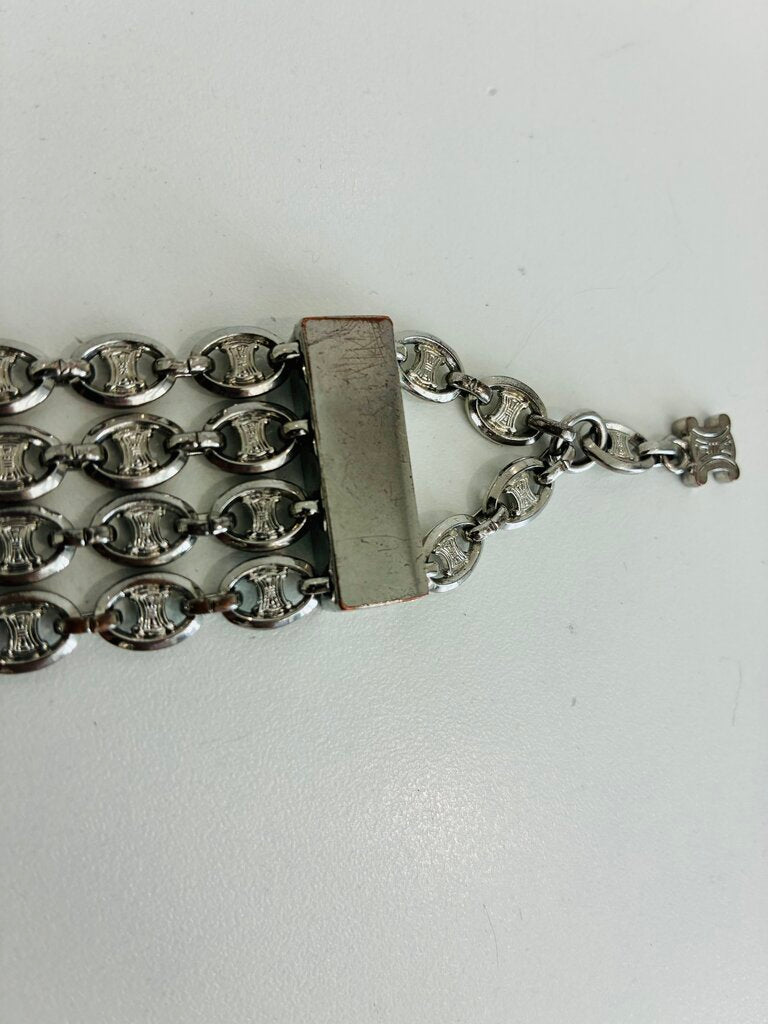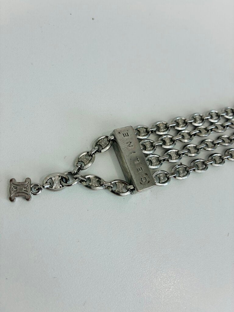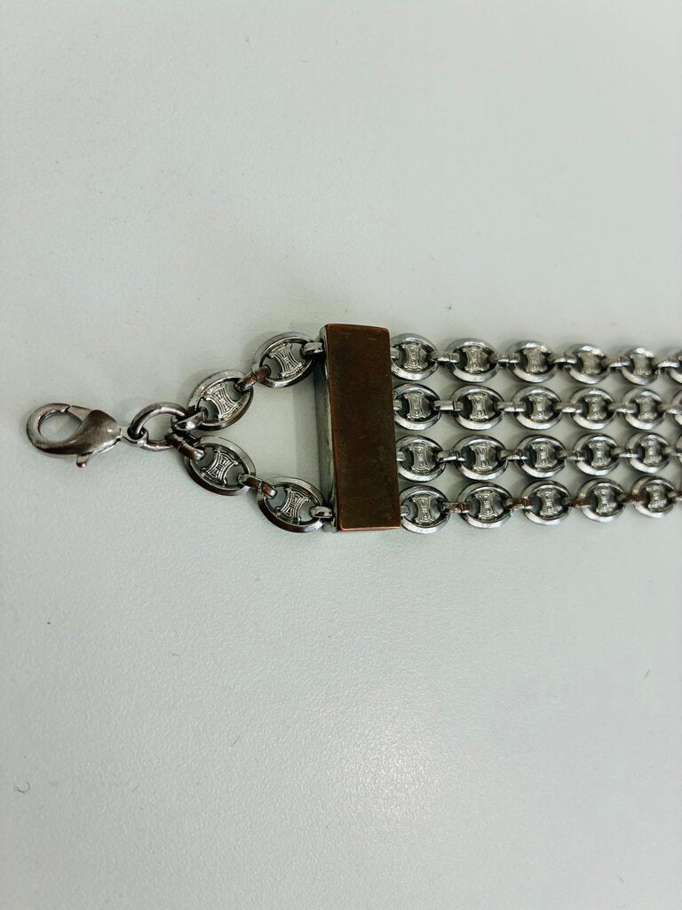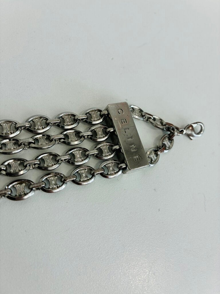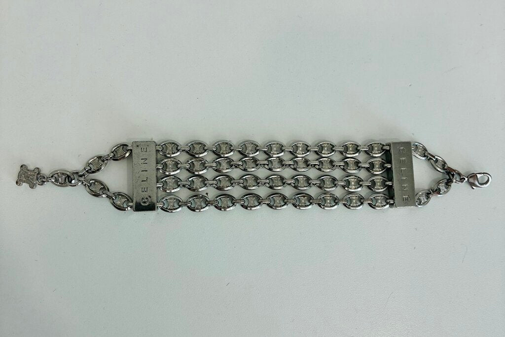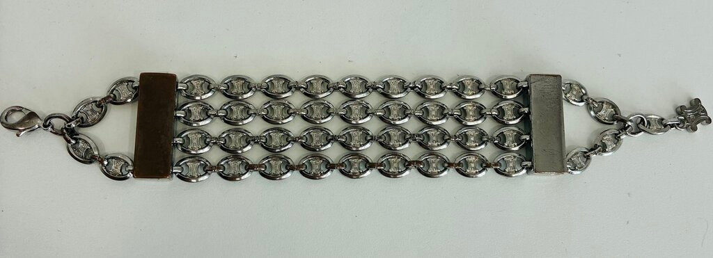 A striking and hard-to-find statement piece from CELINE, this bracelet features four bold curb-style chains anchored by rectangular plaques engraved with the CELINE logo. Its substantial weight, sleek silver-tone finish, and iconic logo detailing make it an instant conversation piece and a collectible example of Celine’s jewelry design.