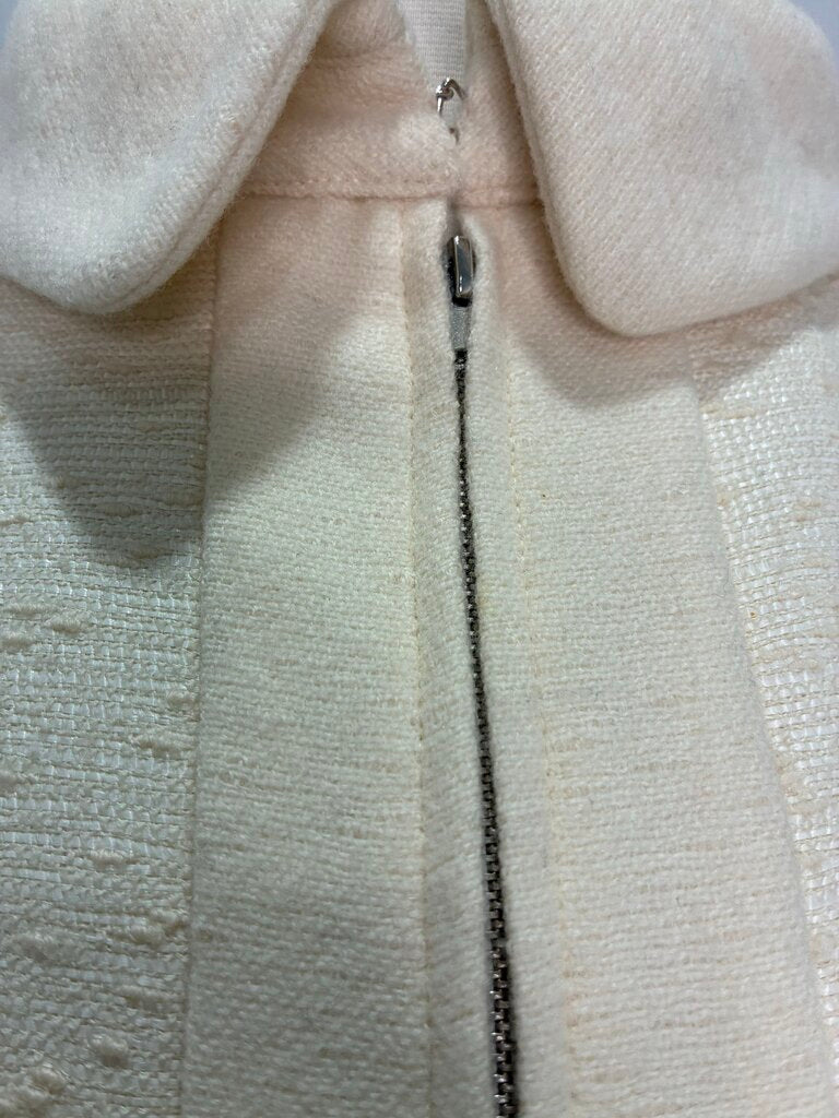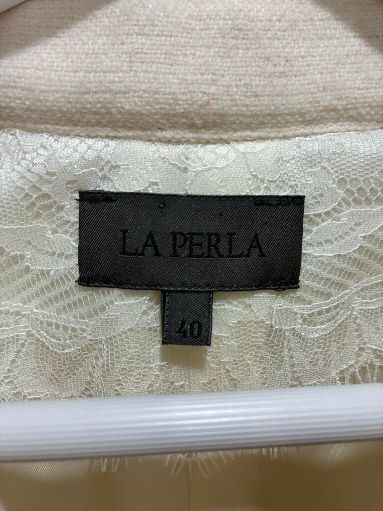 Elegant and effortlessly chic, this La Perla cropped jacket showcases the brand’s refined craftsmanship and impeccable attention to detail. Rendered in a soft cream hue, it is tailored from a luxurious blend of wool and nylon, with a smooth acetate–viscose lining and 100% silk finishing for a delicate, feminine touch.