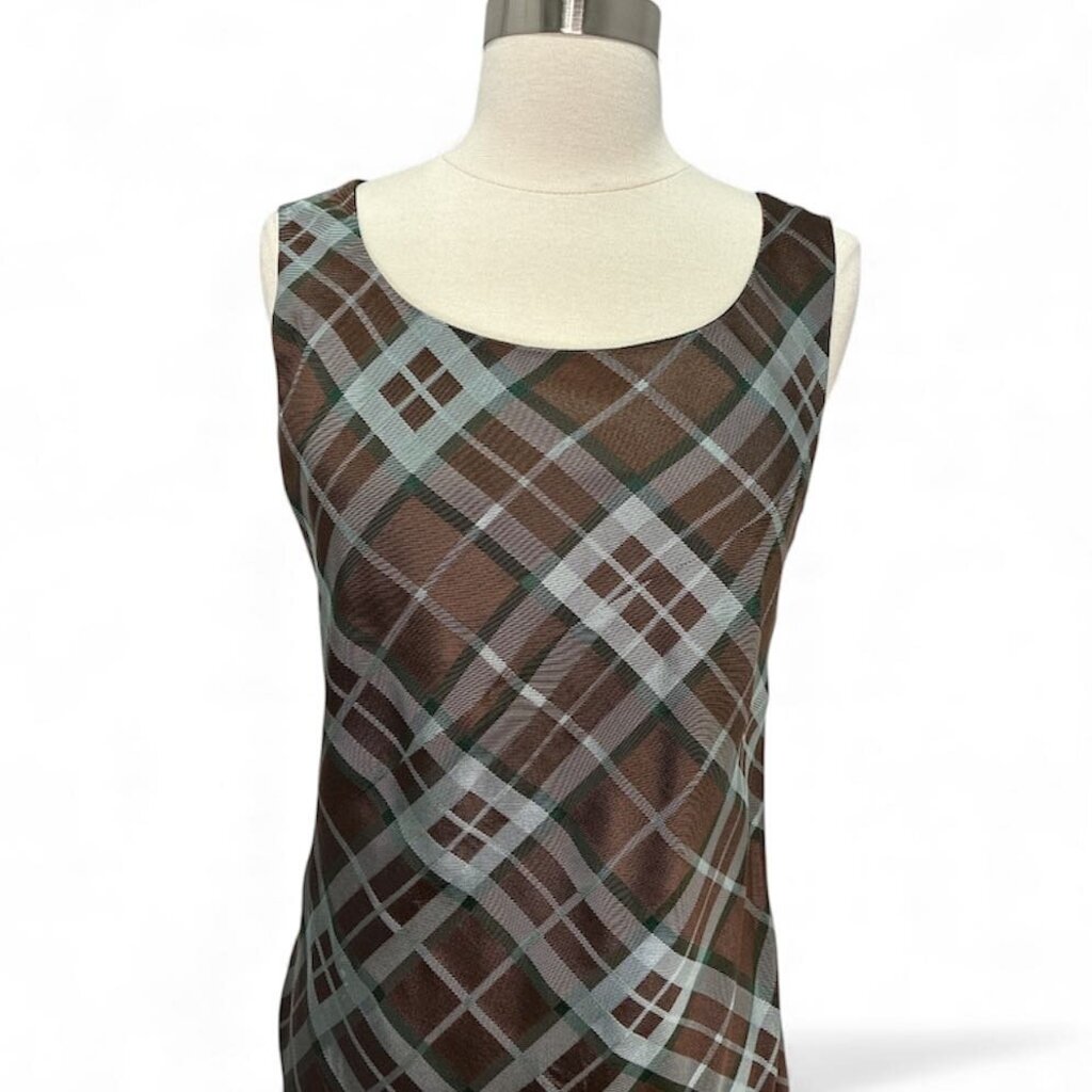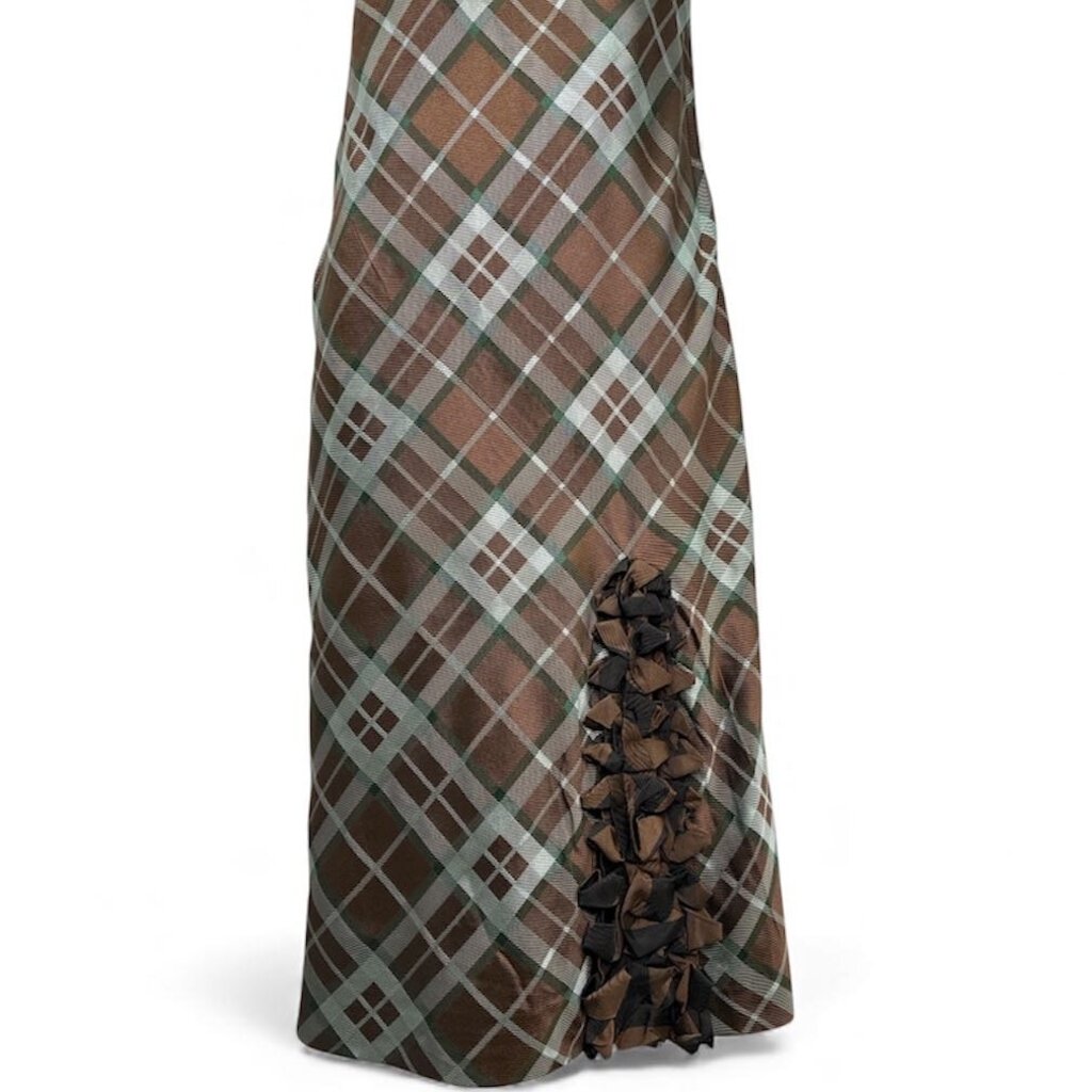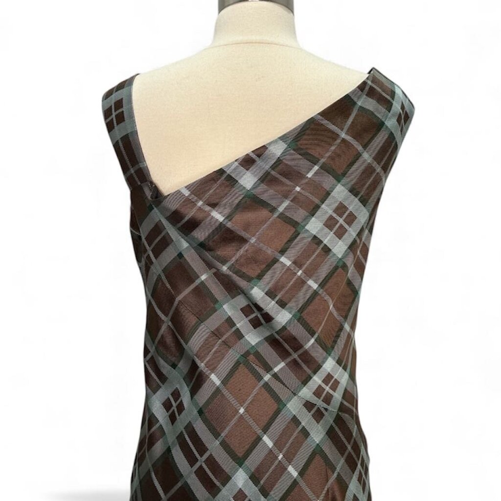 A striking piece from Givenchy’s early 2000s era, this sleeveless dress combines bold patterning with architectural design. The exterior features a distinctive geometric plaid motif in tones of brown, green, and blue, offering a unique interplay of color and structure. Inside, the dress is fully lined in a contrasting brown and black striped pattern, which becomes an intentional design detail at the hem.