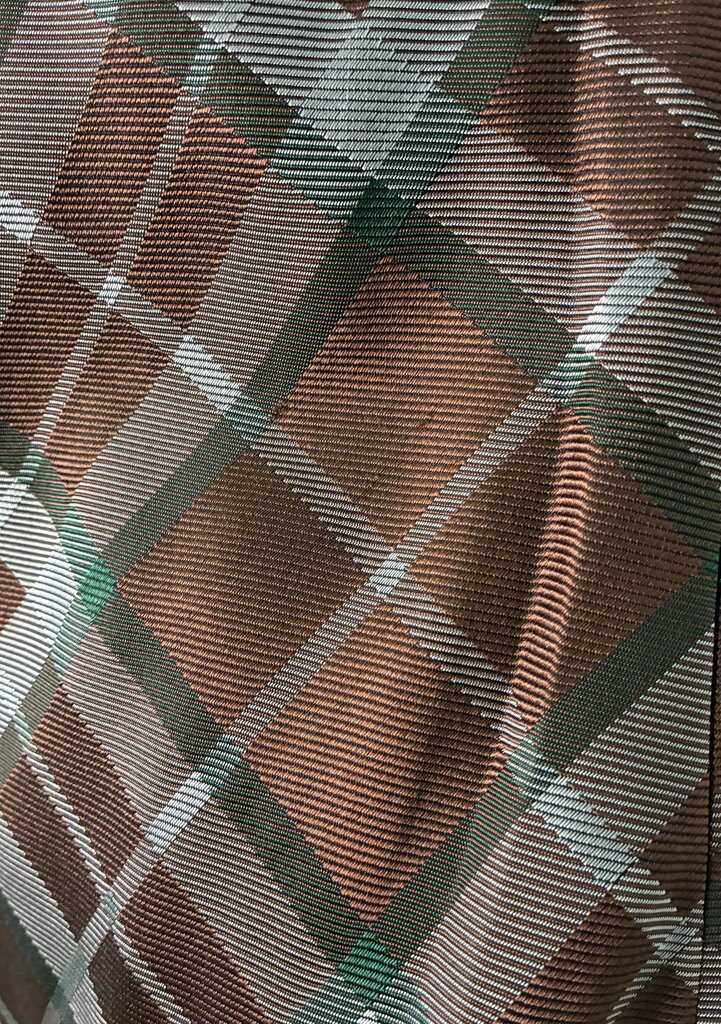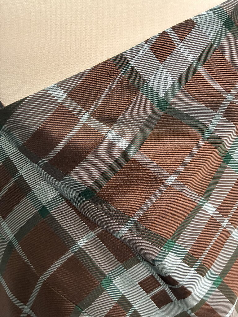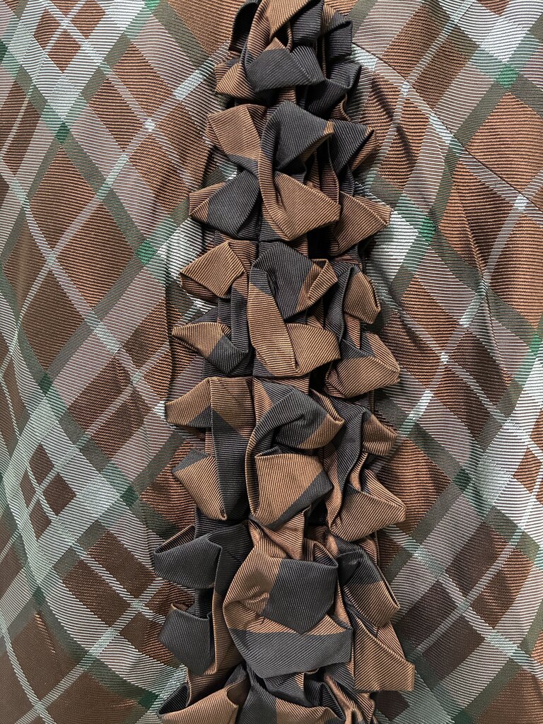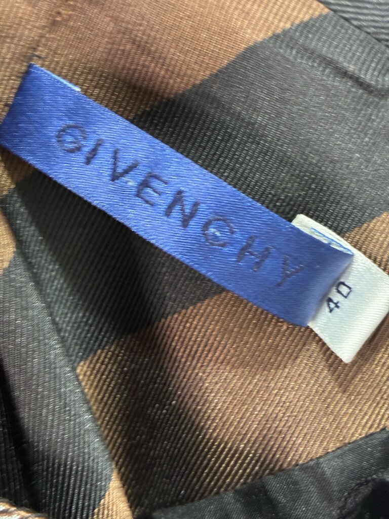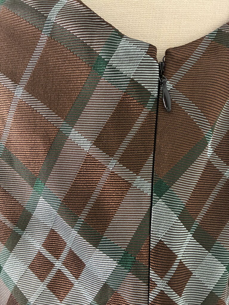 A striking piece from Givenchy’s early 2000s era, this sleeveless dress combines bold patterning with architectural design. The exterior features a distinctive geometric plaid motif in tones of brown, green, and blue, offering a unique interplay of color and structure. Inside, the dress is fully lined in a contrasting brown and black striped pattern, which becomes an intentional design detail at the hem.