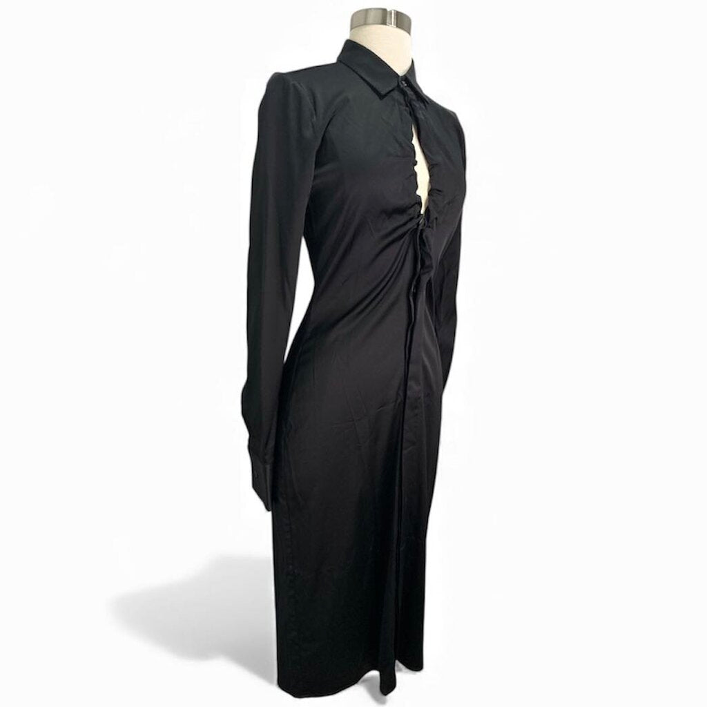 This dress features a concealed button-front closure that creates a clean, minimalist silhouette. Ruching beneath the collared neckline adds soft structure and visual interest, while a keyhole opening between the button placket and the collar button lends a sophisticated, contemporary touch. Long sleeves complete the sleek, elongated profile.