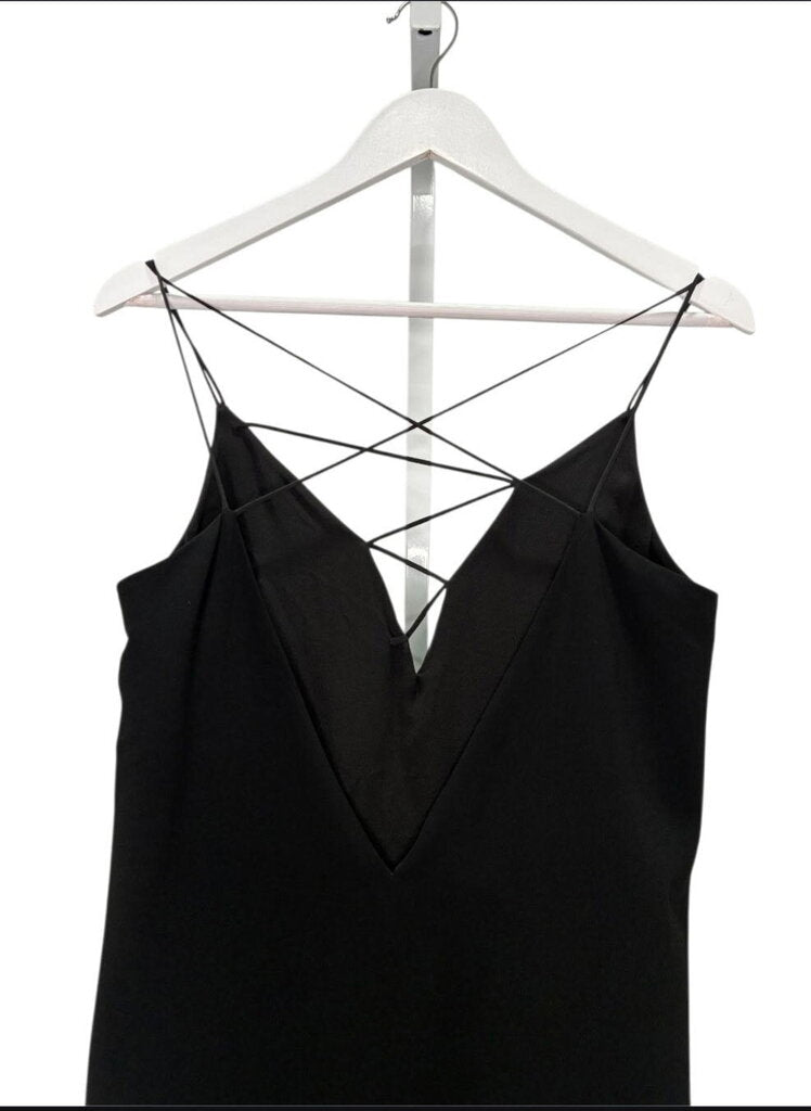 The design features a deep V-neckline with adjustable strappy detailing that can be styled crossed either at the front or the back. A low-cut, open back adds allure, while the hem is finished with intricate lace and leather trim for a dramatic touch. A side Versace-branded zipper completes the look with signature sophistication.