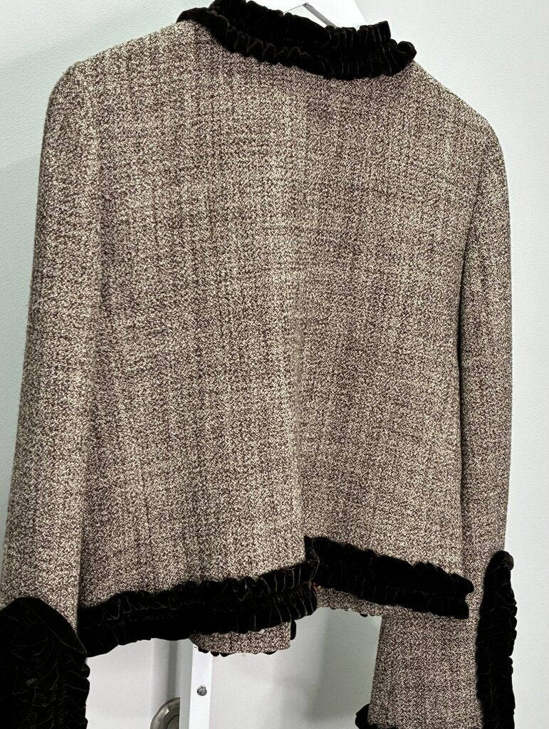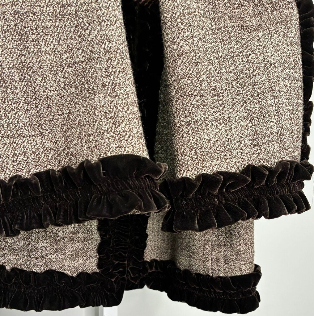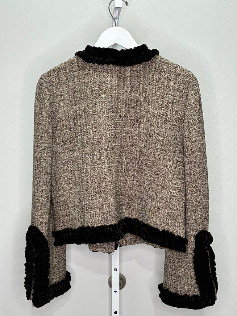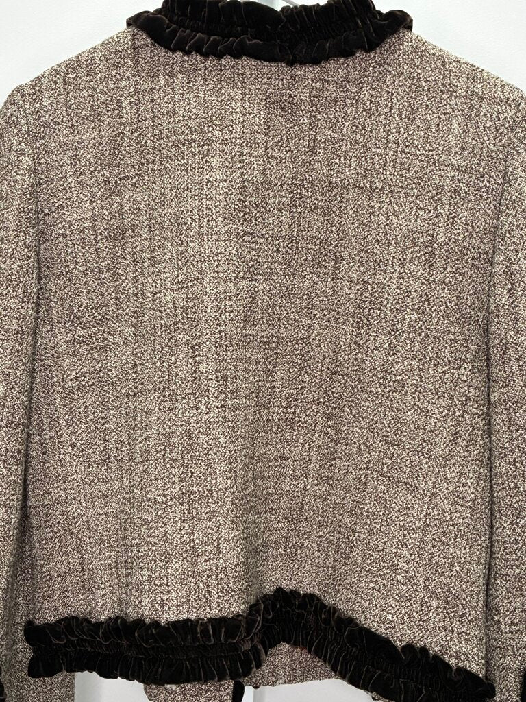 A refined blend of classic tailoring and feminine detail, this Tory Burch Tweed Velvet Trim Collarless Jacket is a timeless statement piece crafted with luxurious texture and rich tones. Made from a premium tweed fabric woven with light, medium, and dark browns, it’s elevated by dark brown velvet trim along the neckline, front edges, and cuffs, finished with delicate ruffled accents.