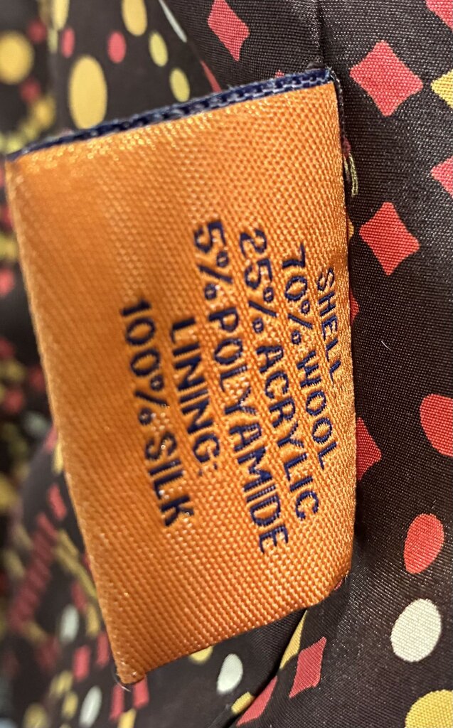 The jacket features wide sleeves with subtle slits that highlight the ruffled trim, adding soft movement and dimension to its structured silhouette. Fully lined in 100% silk for a smooth, comfortable wear, the outer composition includes 70% wool, 25% acrylic, and 5% polyamide—ensuring warmth and durability.