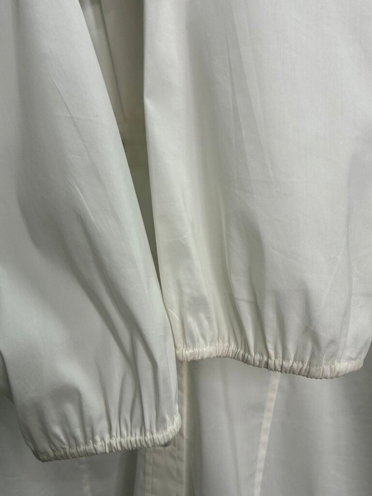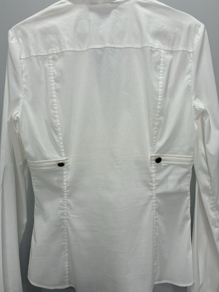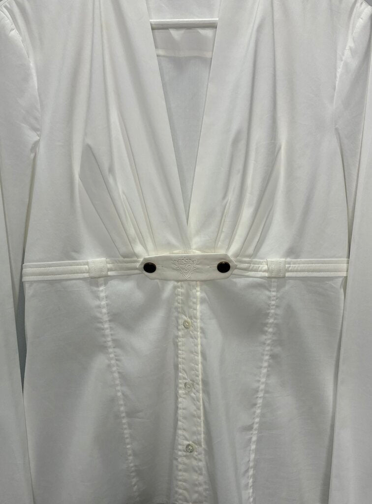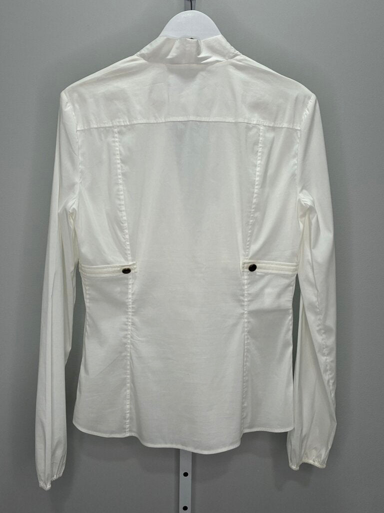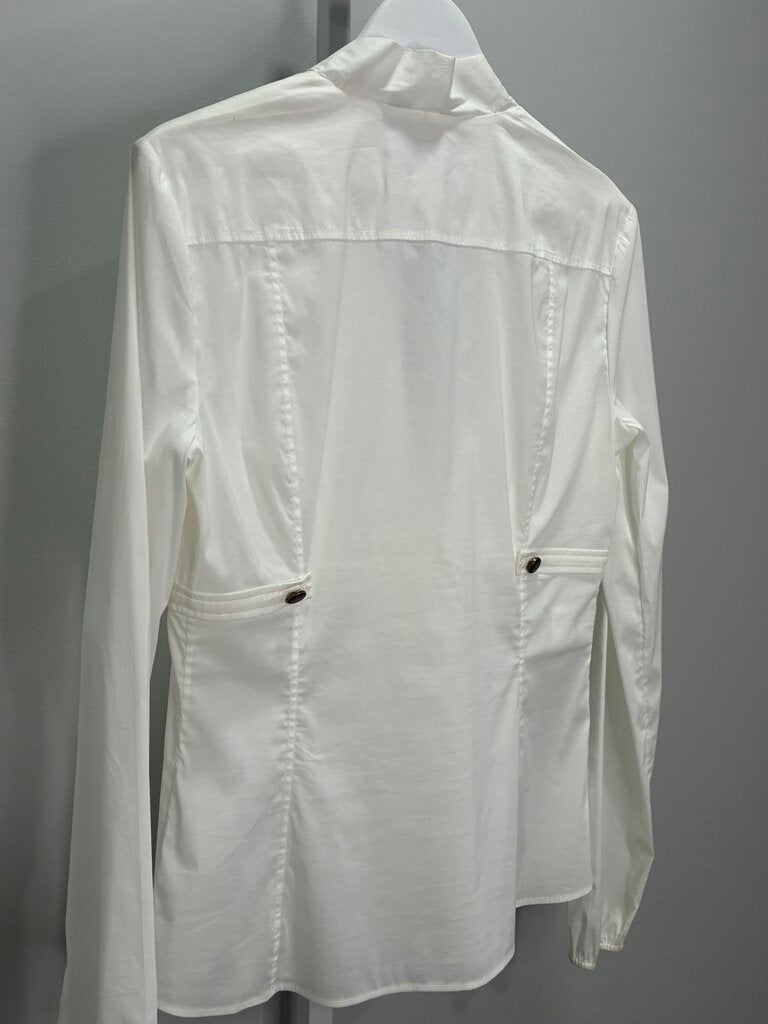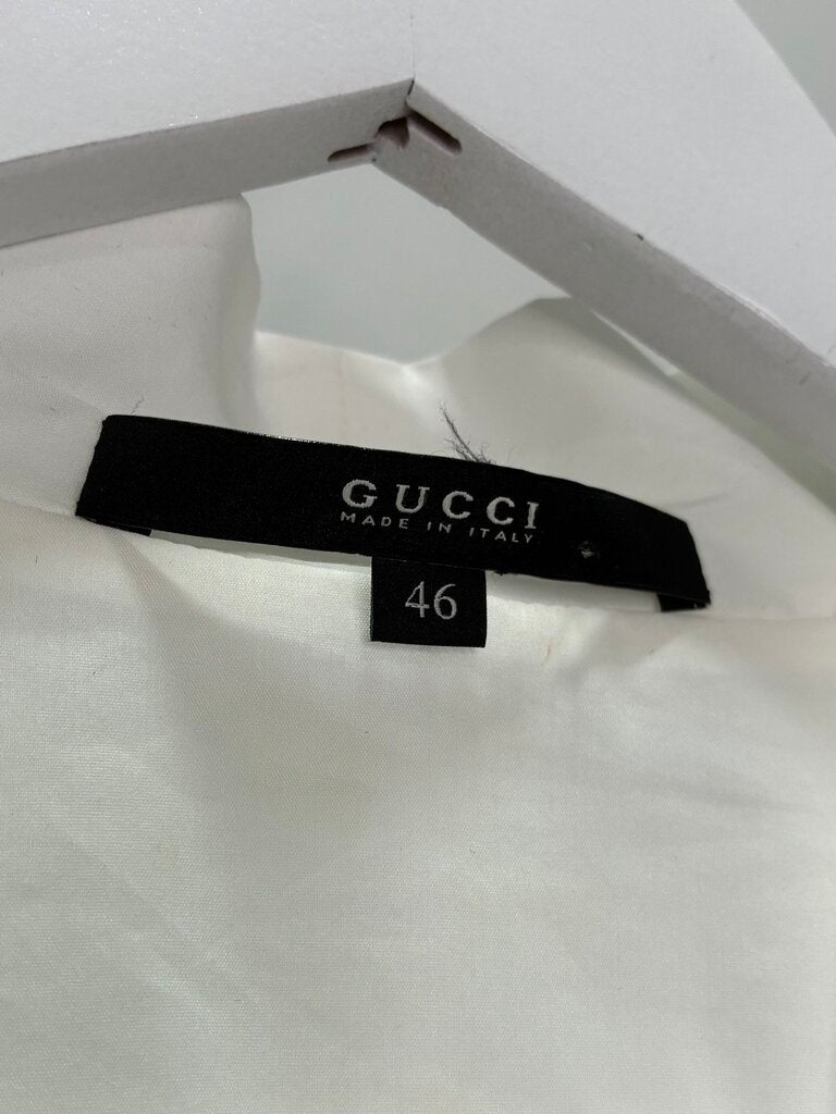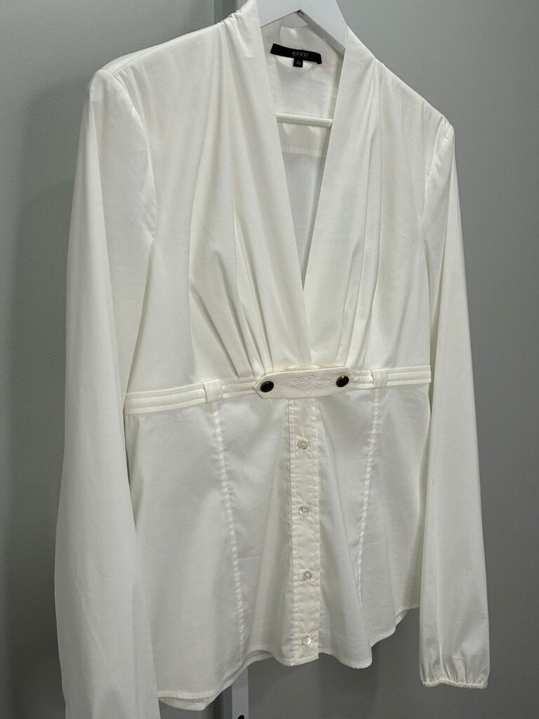 Finished in a brilliant, crisp white, the blouse proudly displays the iconic Gucci crest at the center—an emblem of heritage and luxury. It retains all original Gucci tags and detailing, a true testament to its authenticity and craftsmanship.