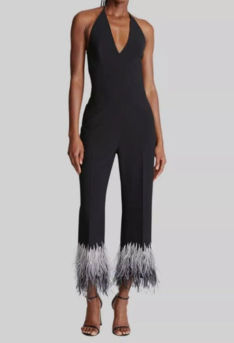 NWT Kaitlyn Halter Feather Cuff Crepe Jumpsuit