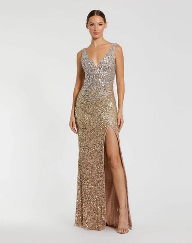 NWT Gold Sequined Sleeveless V Neck Side Slit Gown