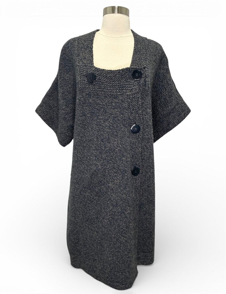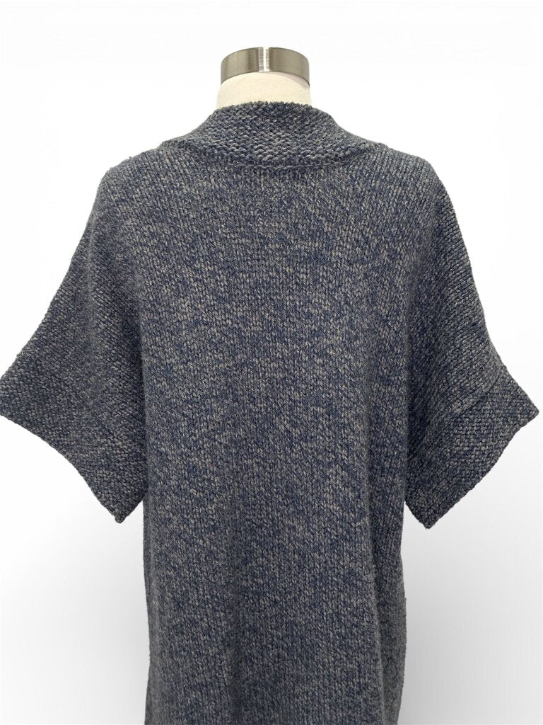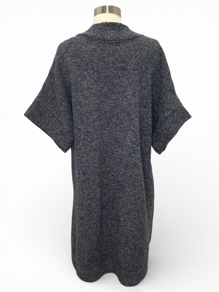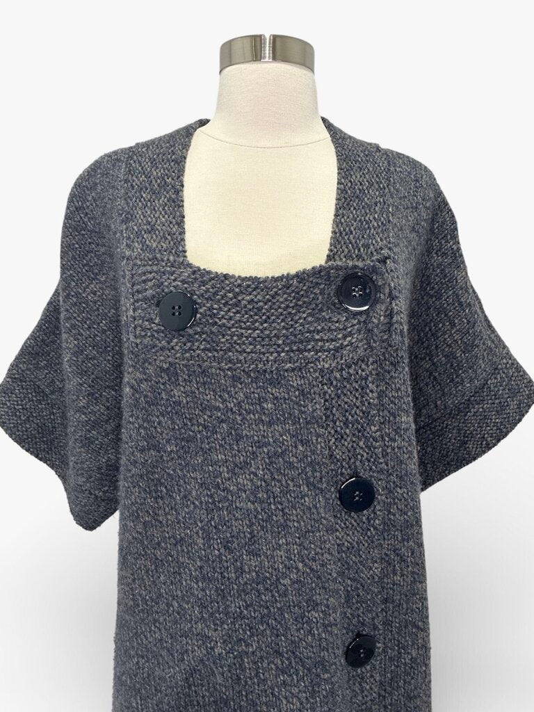 Crafted from a luxurious blend of 80% wool and 20% cashmere, this Stella McCartney sweater dress features a sophisticated knit in a mix of navy blue and grey tones. The design highlights a distinctive square neckline with wide short sleeves for a modern silhouette.
