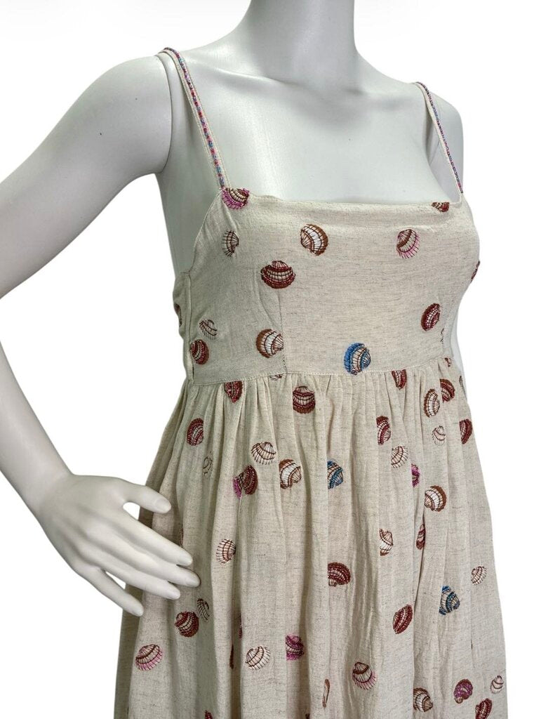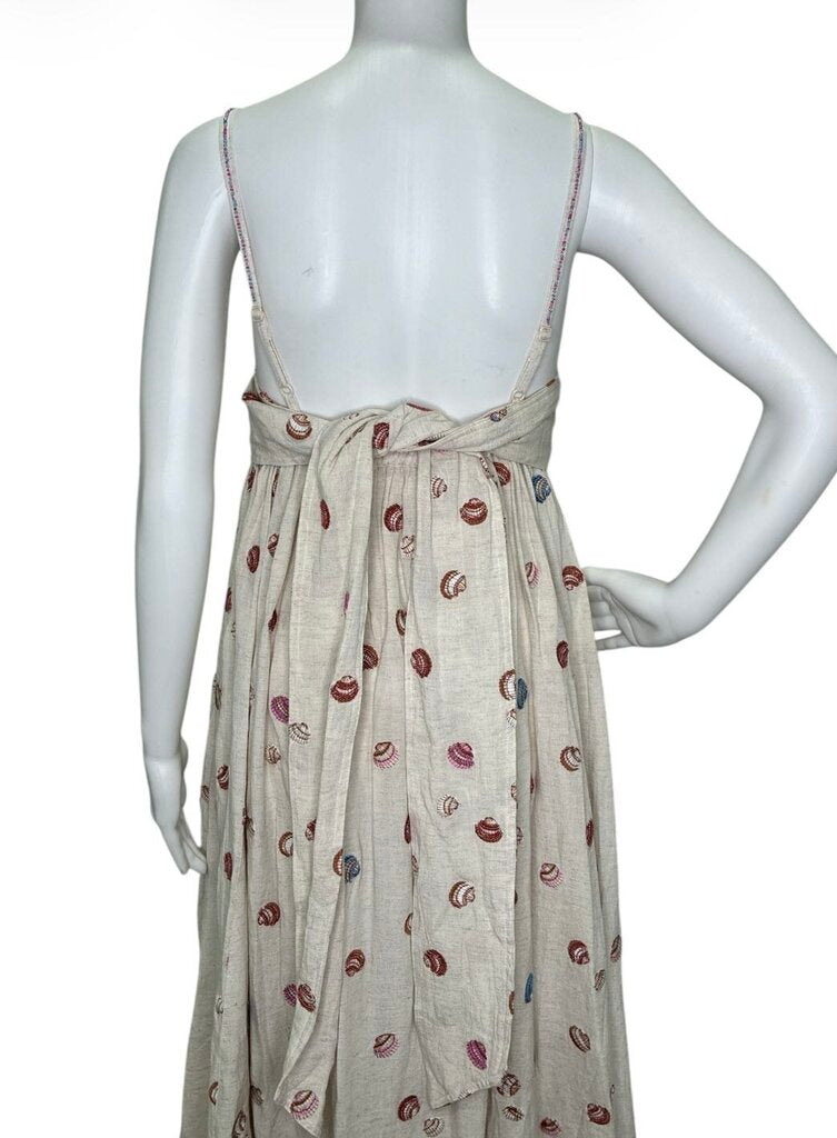 Designed for effortless elegance, it features adjustable beaded spaghetti straps, an elastic back with a tie for a customizable fit, and functional pockets. The hem is finished with delicate shell embellishments, adding subtle movement and texture to the flowing silhouette.