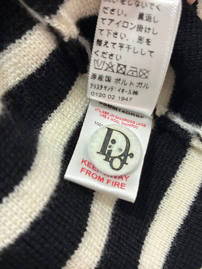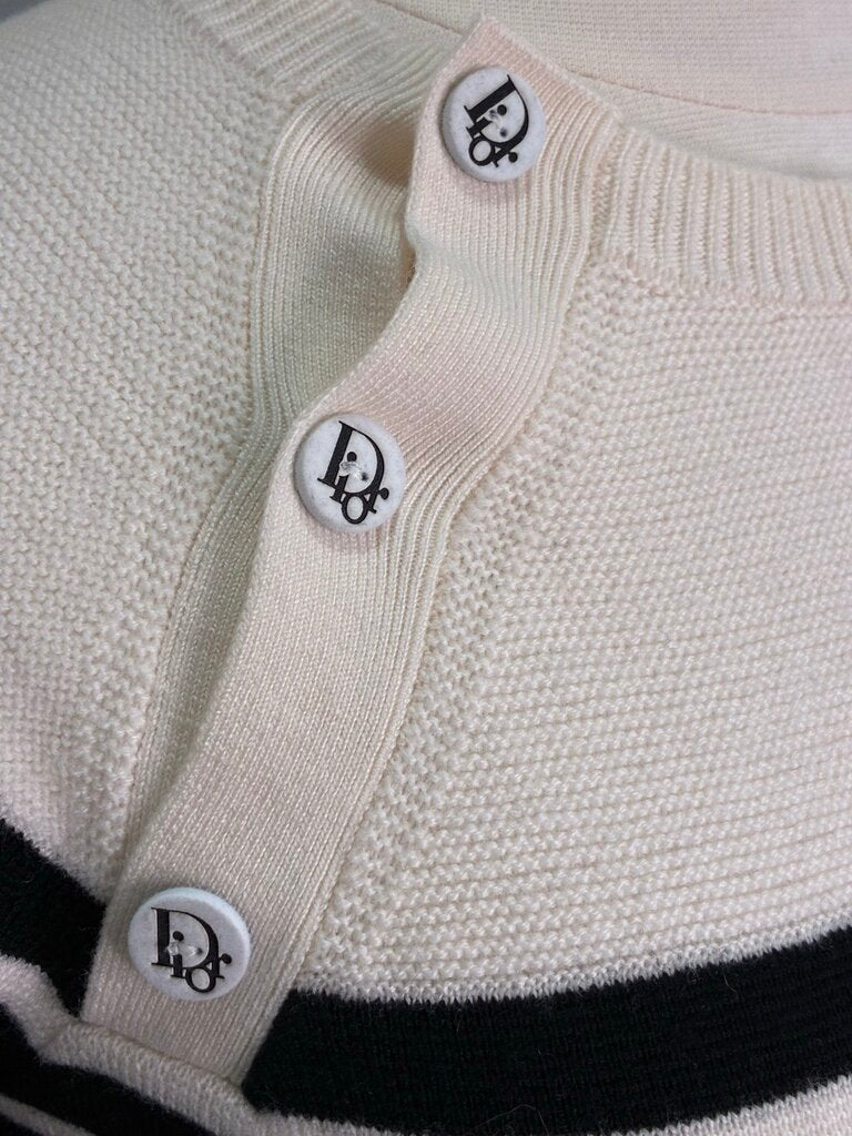 This is a true Dior Enfant collectible with that unmistakable early 2000s Galliano charm. Crafted in a soft and stretchy 100 percent wool knit, this long sleeve black and white nautical striped dress features Dior’s classic marinière styling elevated with rare novelty hardware.