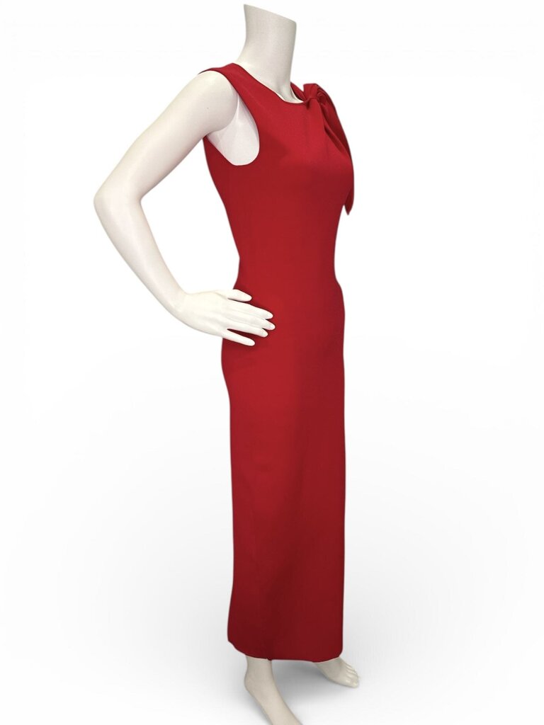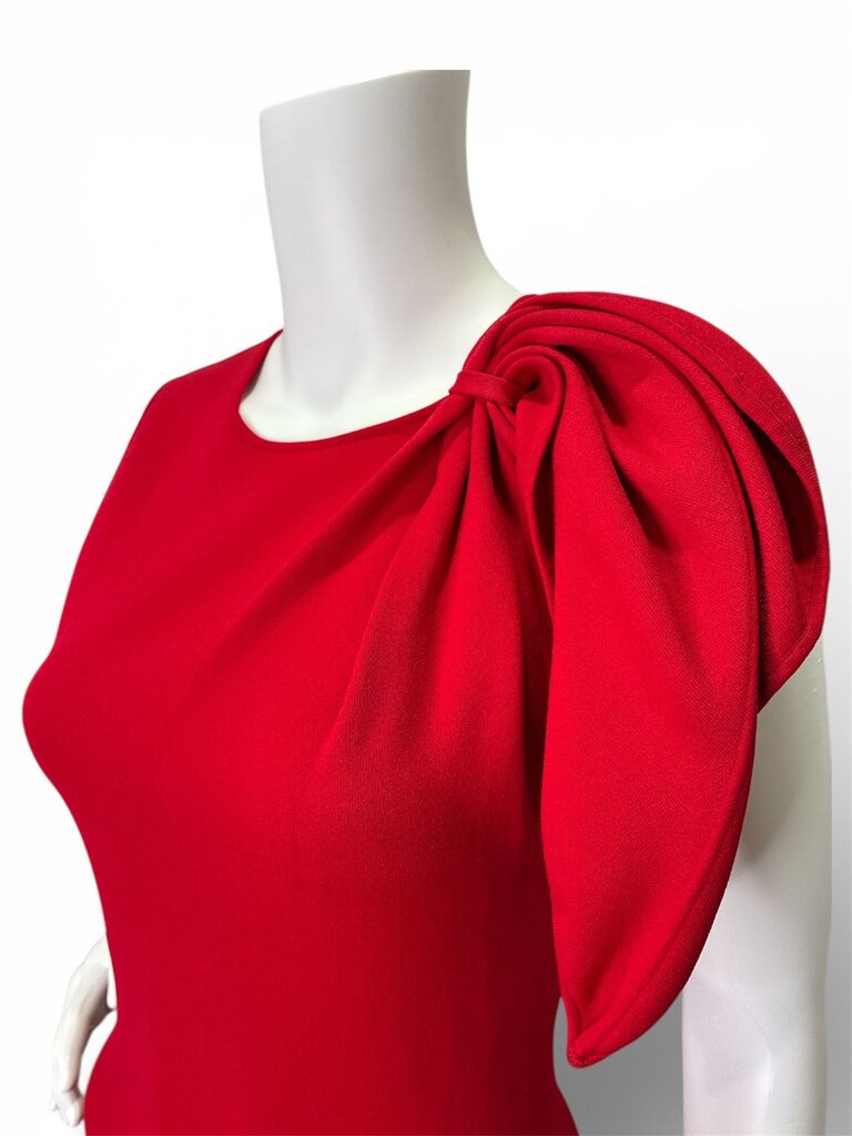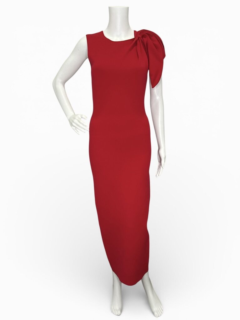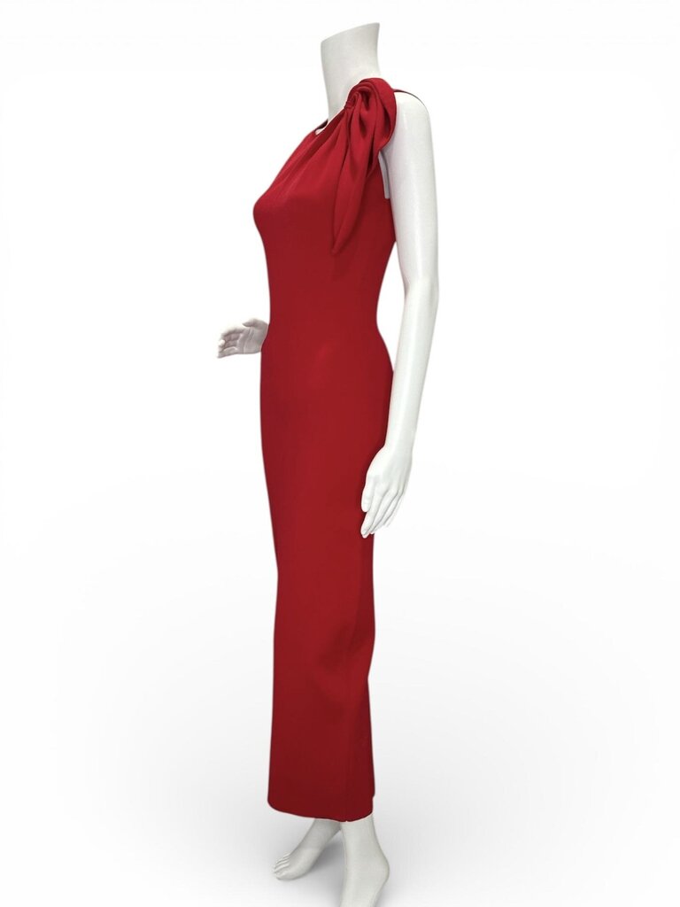 Rendered in a striking red hue, the design features a structured, knotted sash detail at one shoulder, creating an asymmetrical silhouette with modern appeal. The sleeveless cut is complemented by a back slit for ease of movement and a concealed back zipper for a seamless finish.