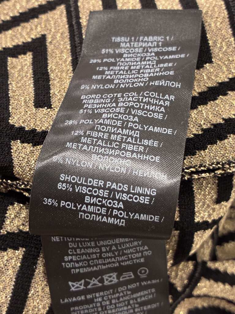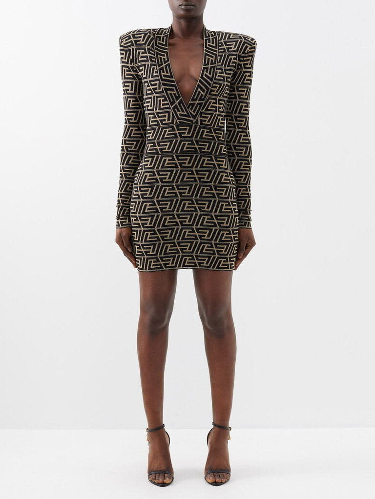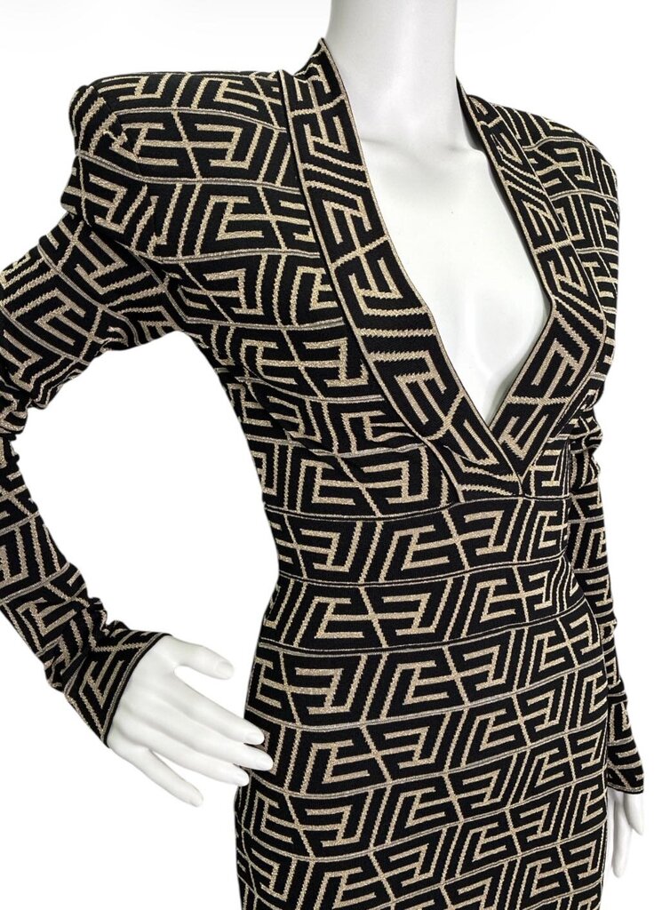 Designed with a flattering V-neckline and long sleeves, the dress features structured shoulder pads to enhance and define the shoulders. The bodycon fit contours beautifully, while a gold-tone branded zipper runs down the back, adding both function and statement hardware detail.