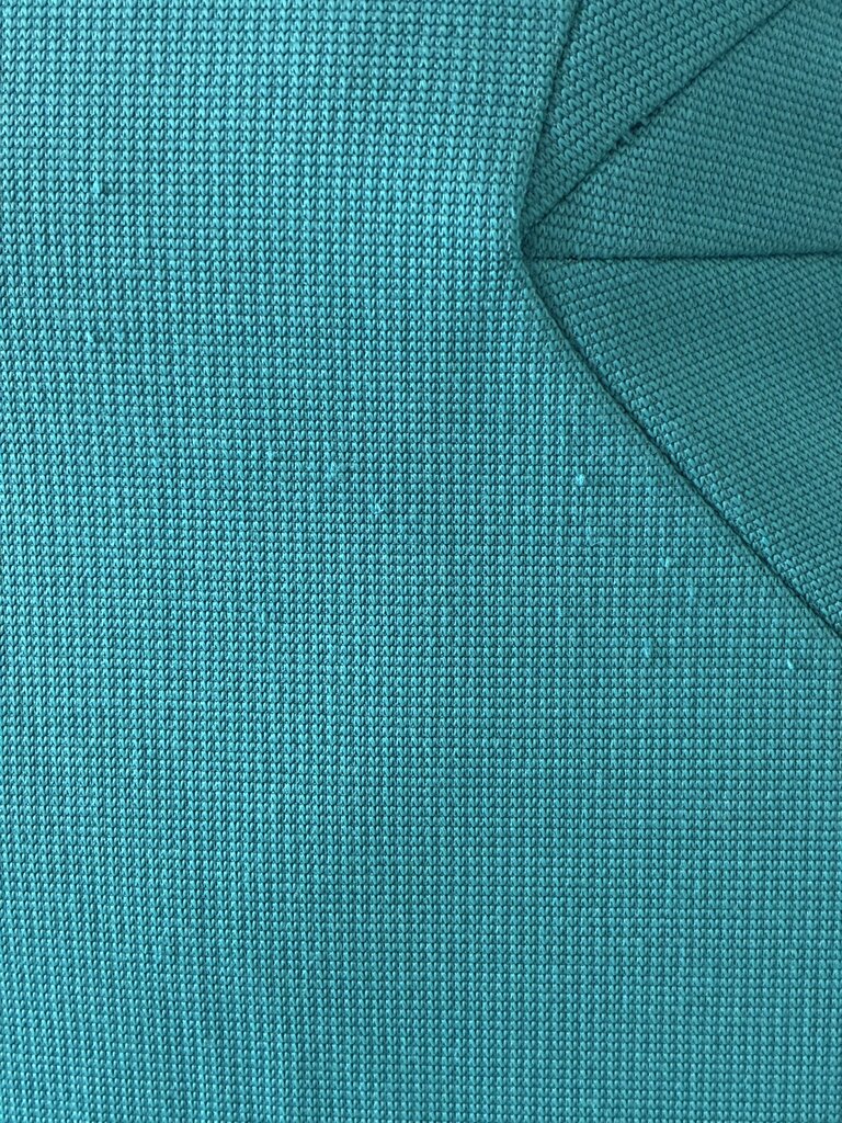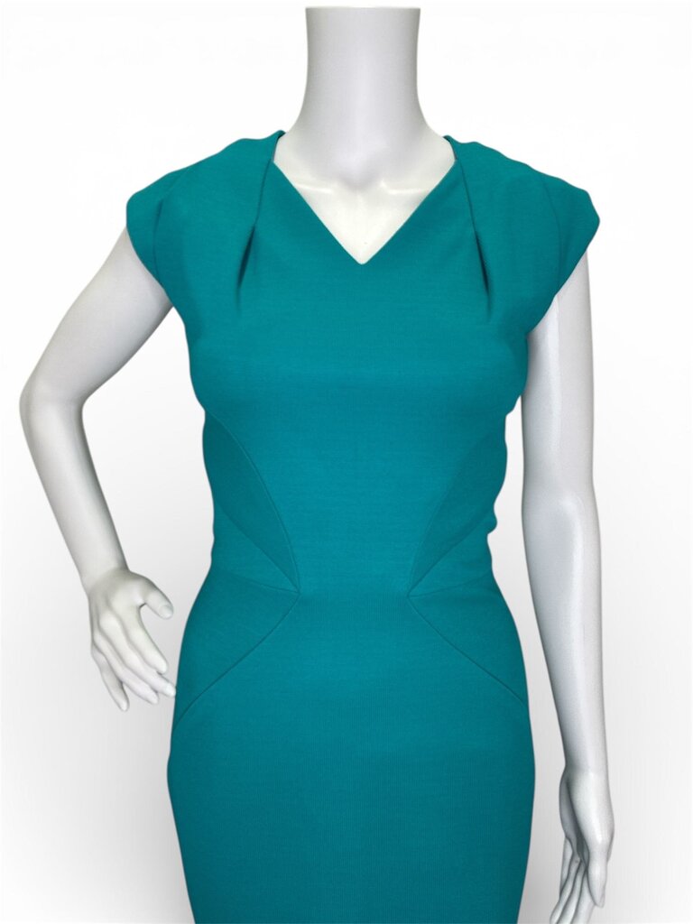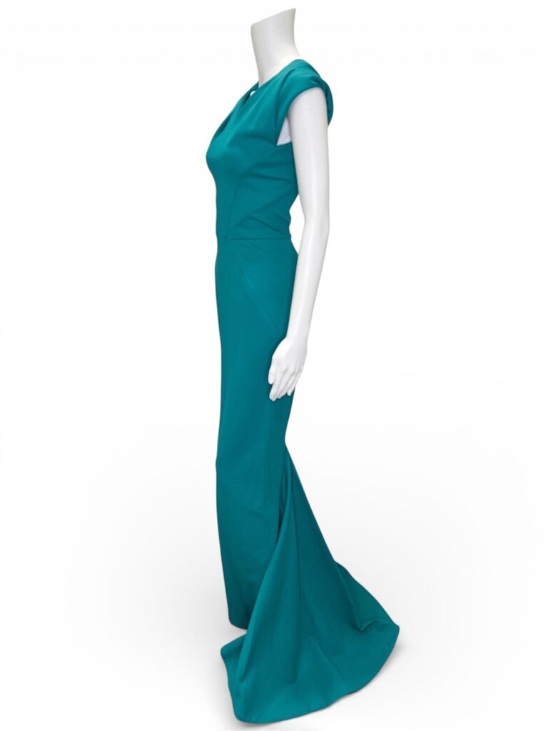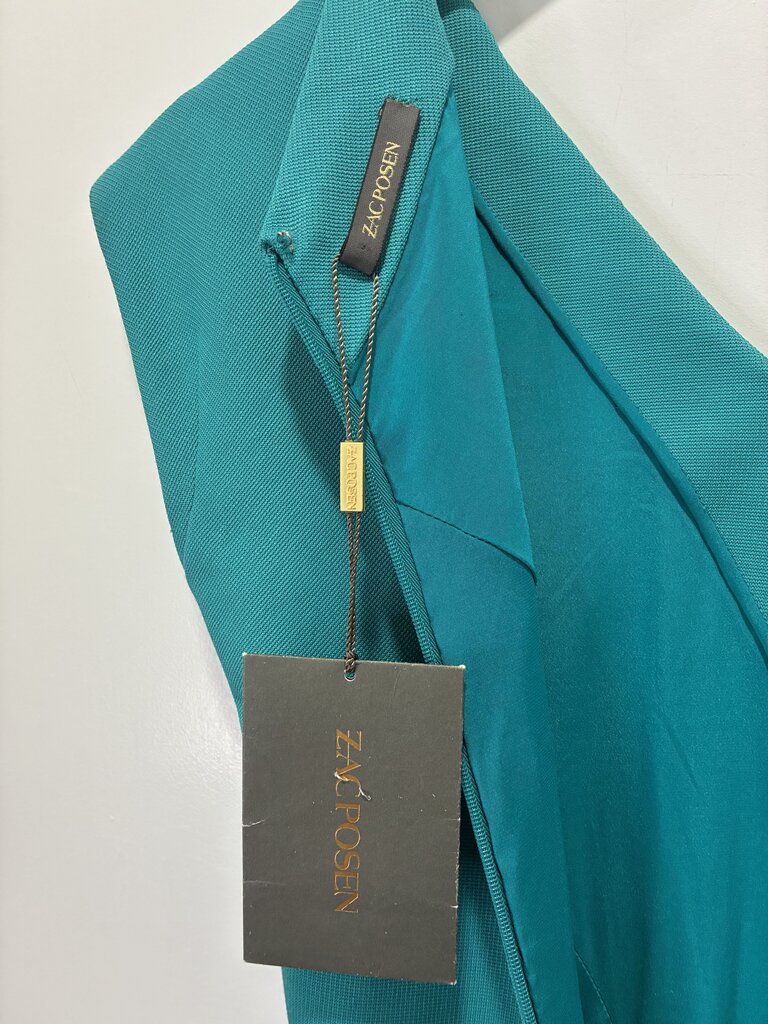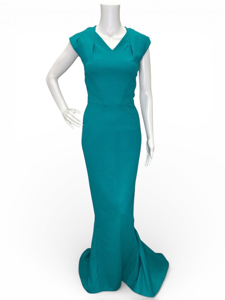 Zac Posen- new with tags, gorgeous teal mermaid style gown. Slight capped short-sleeves with geometric lined seams to highlight any figure, this gown is amazing for any formal occasion. Floor length and with a tailored train that adds some additional length to the back of the gown, this dress will stun on anyone! Small stain on back left waist area and on back of train- assume from try-ons prior to our store attaining this beautiful piece.