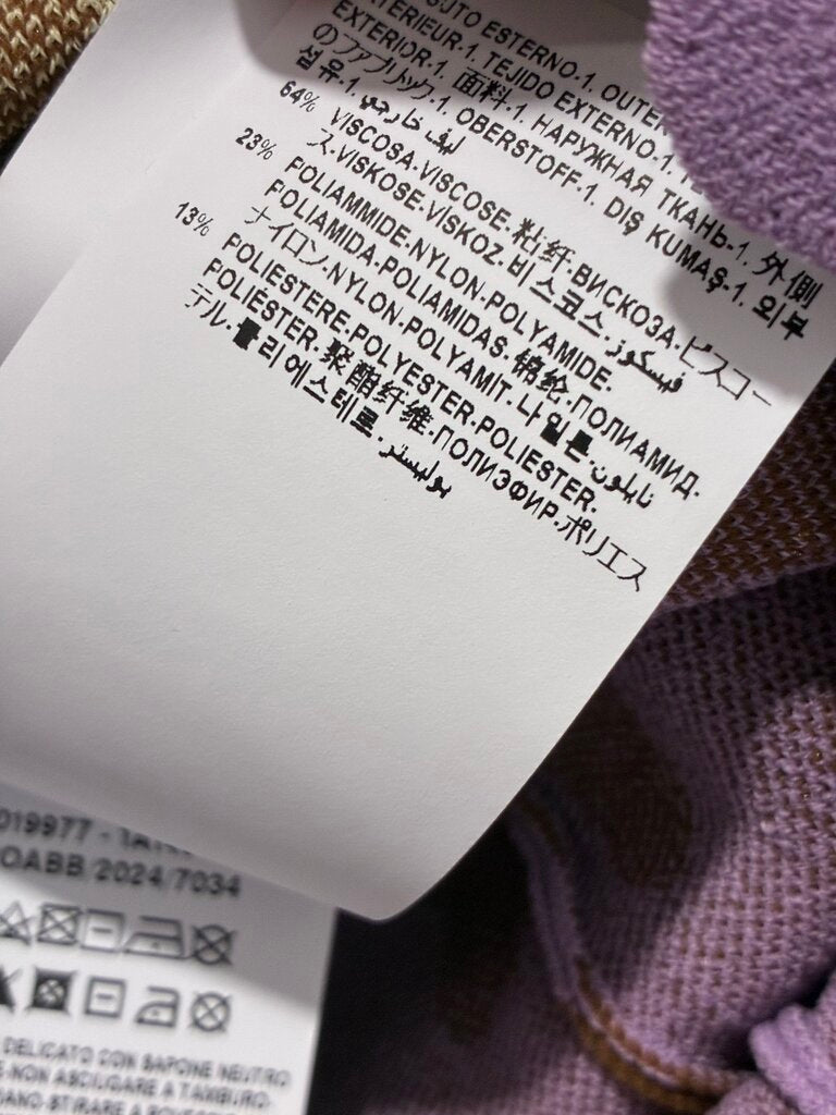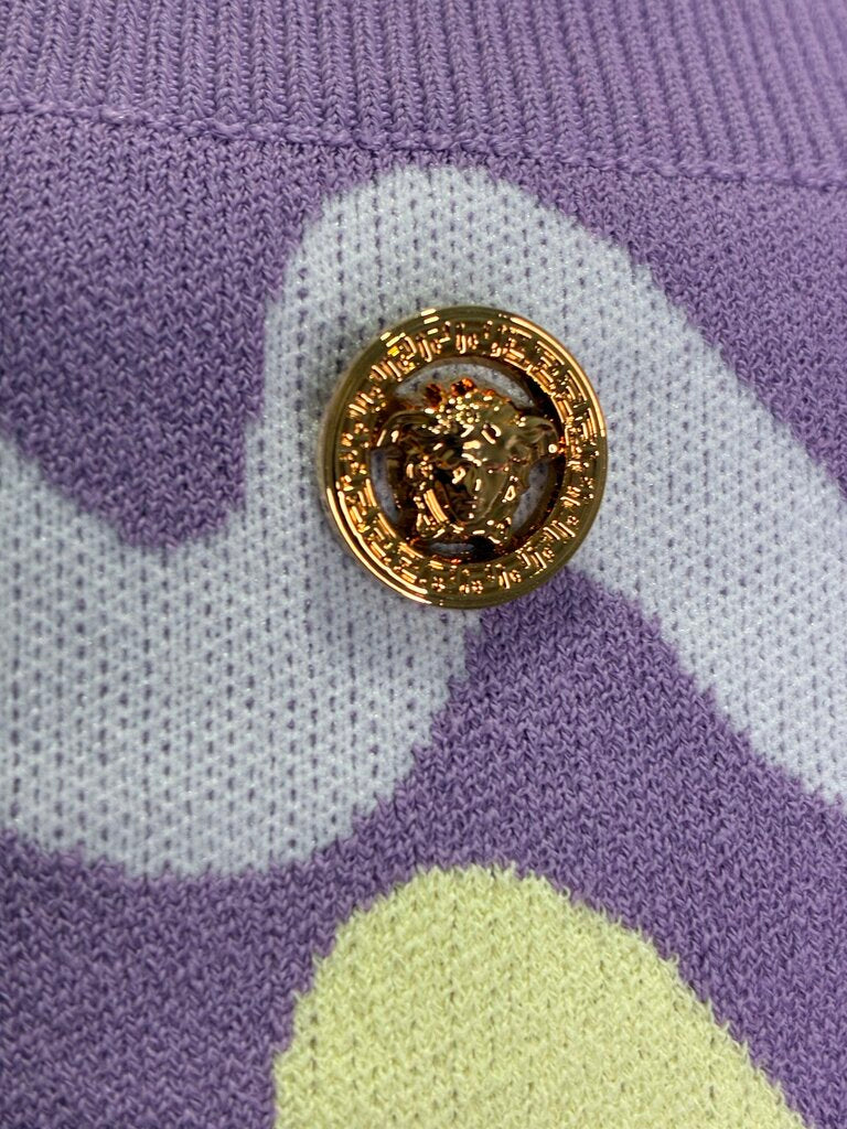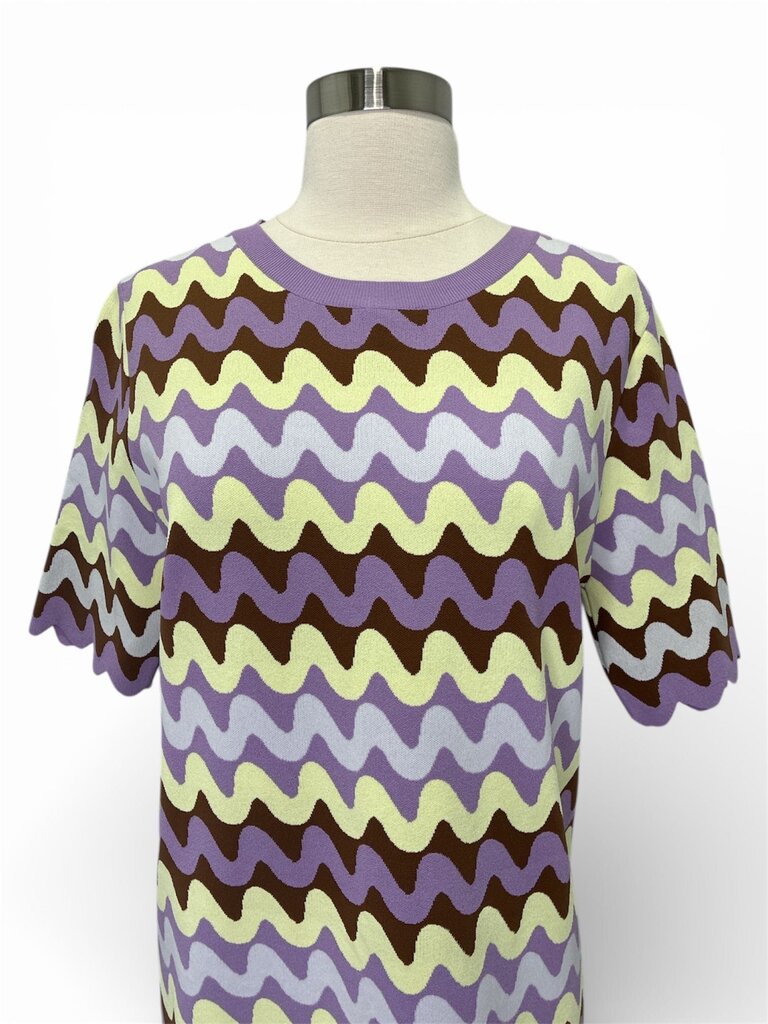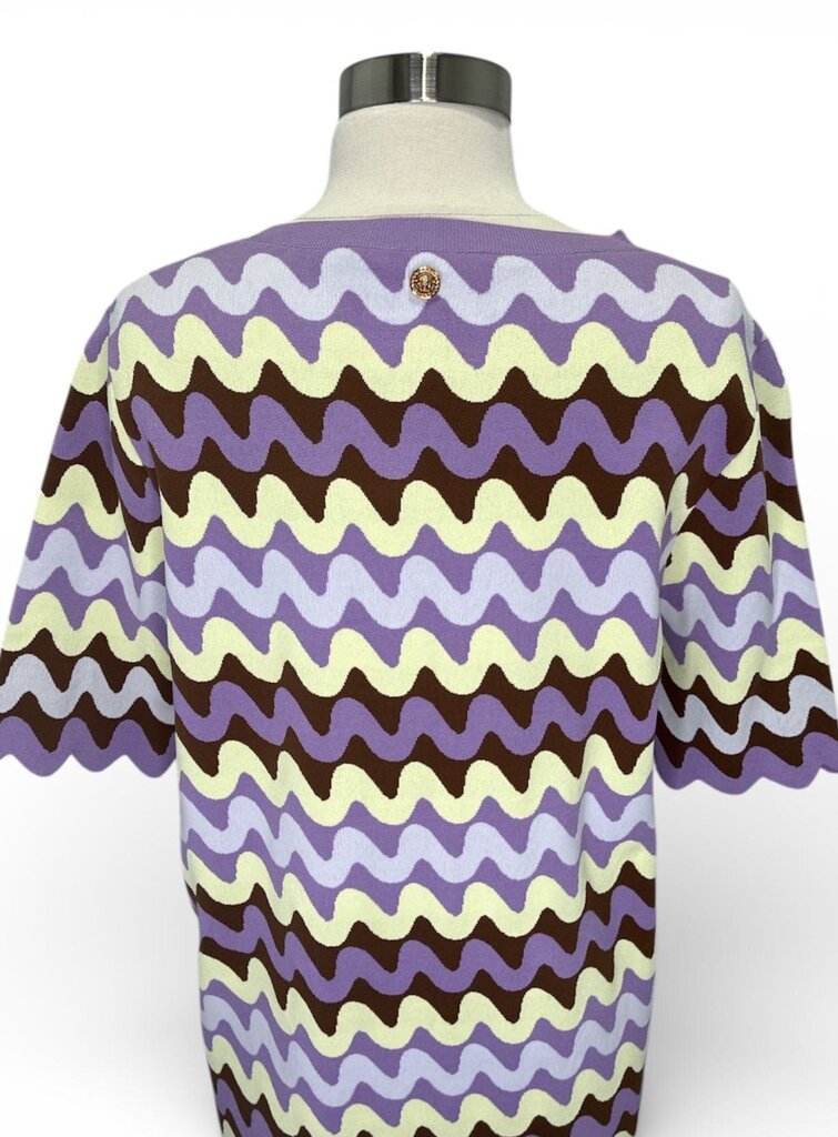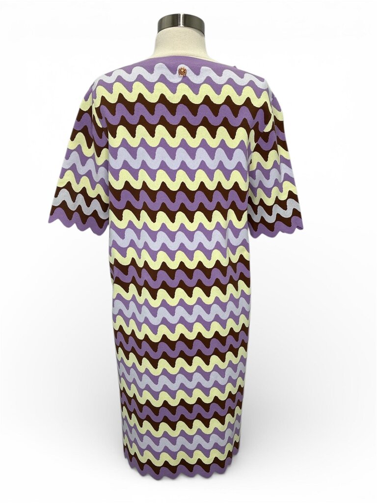 A bold and sophisticated piece from Versace, this midi T-shirt dress features a striking wave jacquard pattern in purple, brown, and cream tones. Crafted from a premium blend of 64% viscose, 23% polyamide, and 13% polyester, the dress offers a soft, structured drape.