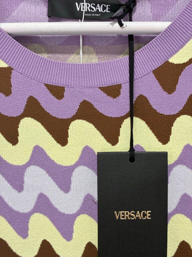 The design includes a classic crew neckline, patterned sleeves and hem that follow the wave motif, and a gold-tone metal Versace logo plaque at the back neckline for a signature touch.