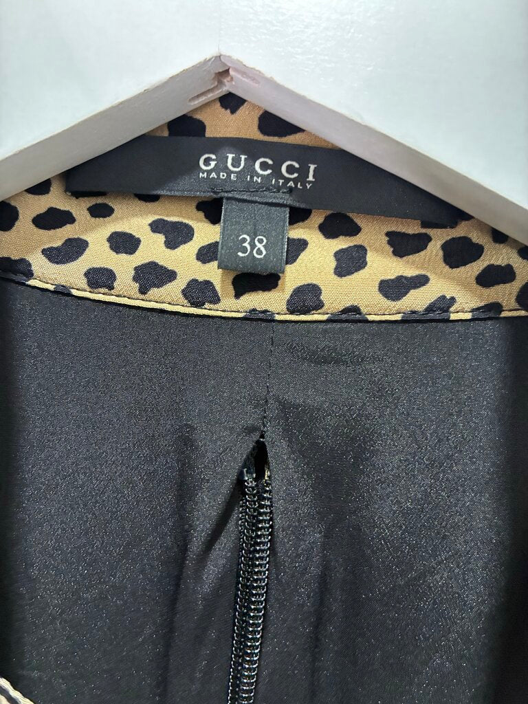 The dress is richly detailed, beginning with a hidden back zipper finished with a Gucci-branded pull. The front showcases side chest hidden branded buttons, along with two gold-tone Gucci-branded buckles—one across the chest and another at the collar. The collar also includes hook clasp closures for a secure and polished look.
