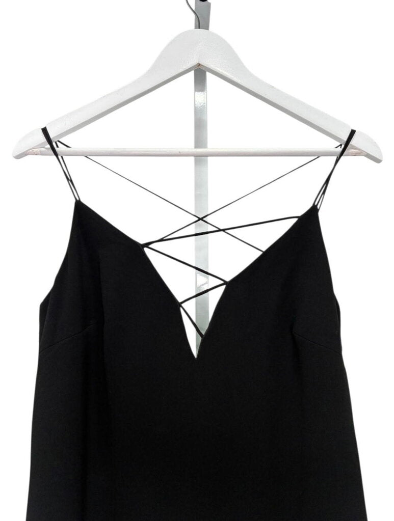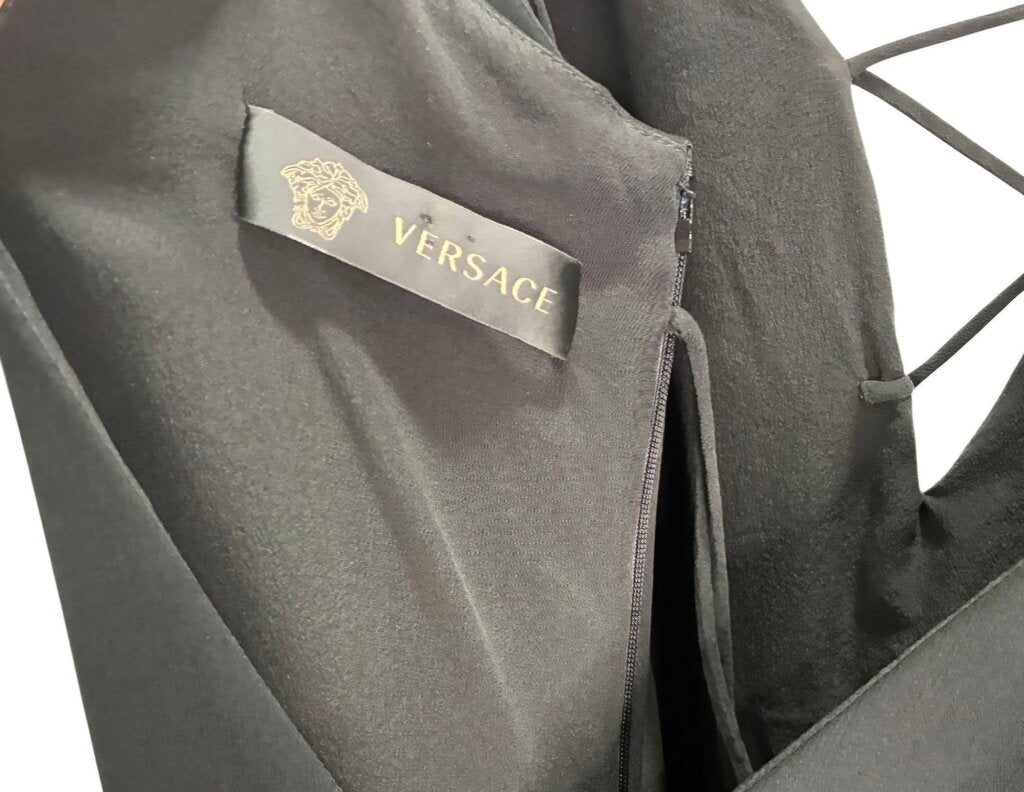 The design features a deep V-neckline with adjustable strappy detailing that can be styled crossed either at the front or the back. A low-cut, open back adds allure, while the hem is finished with intricate lace and leather trim for a dramatic touch. A side Versace-branded zipper completes the look with signature sophistication.