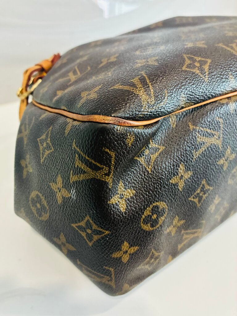 Please Note: This bag is in good preloved condition with visible signs of wear consistent with use. The vachetta leather has developed a natural patina throughout, with noticeable wear at the corner piping. There is color loss to the hardware and staining present on the interior lining. The Monogram canvas remains in good shape, showing only a few small white marks that are not very noticeable. Please review all photos for detailed condition.