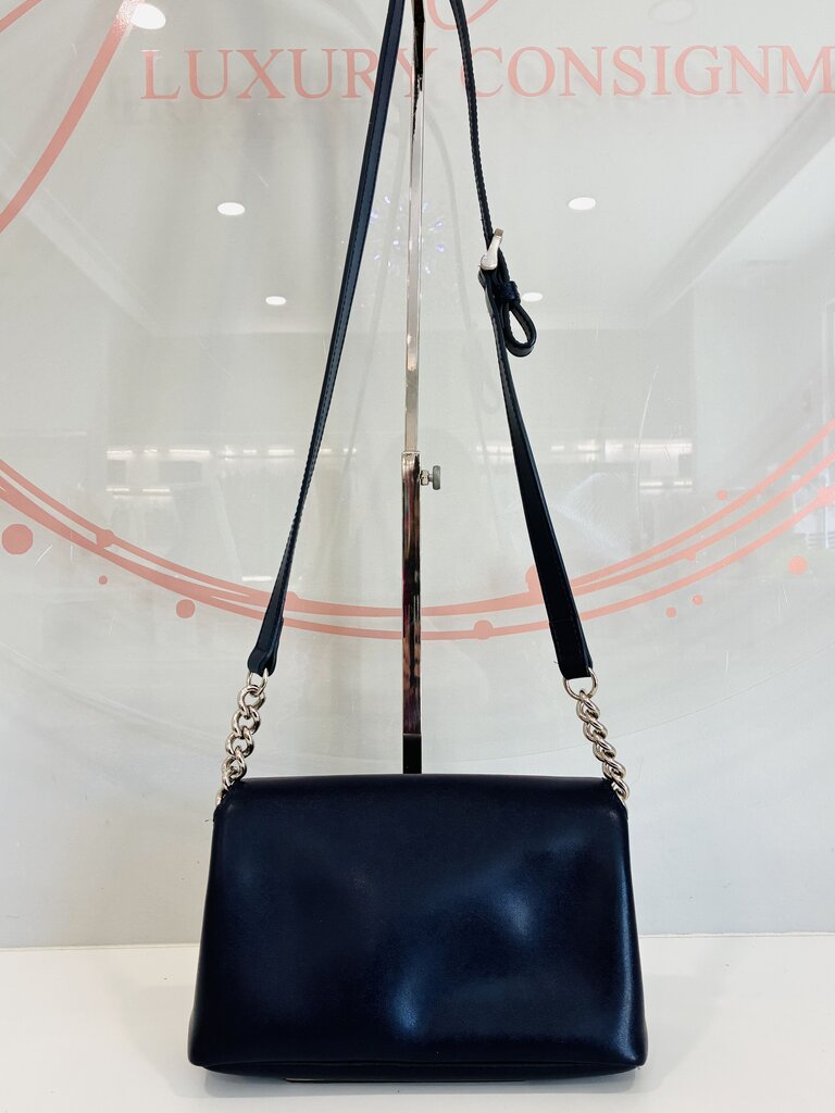 This elegant Longchamp Honore Rosato 404 Crossbody Bag features smooth navy-blue leather paired with sleek silver hardware for a timeless, refined look. The bag is in excellent preloved condition, with the leather, structure, flap, and interior all beautifully maintained.