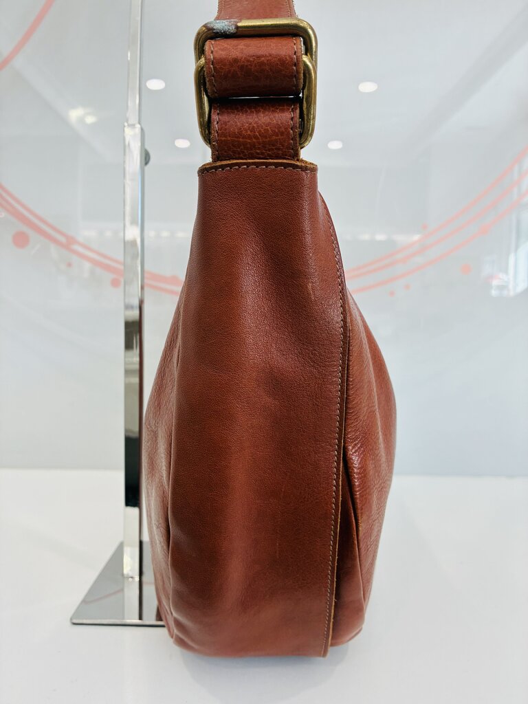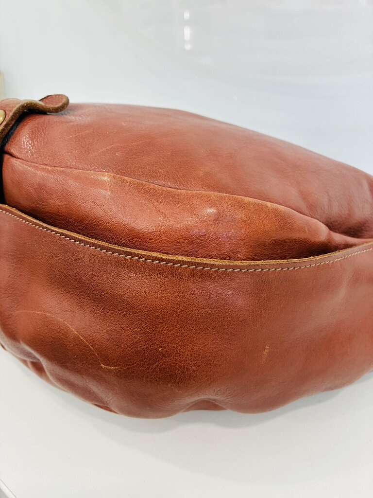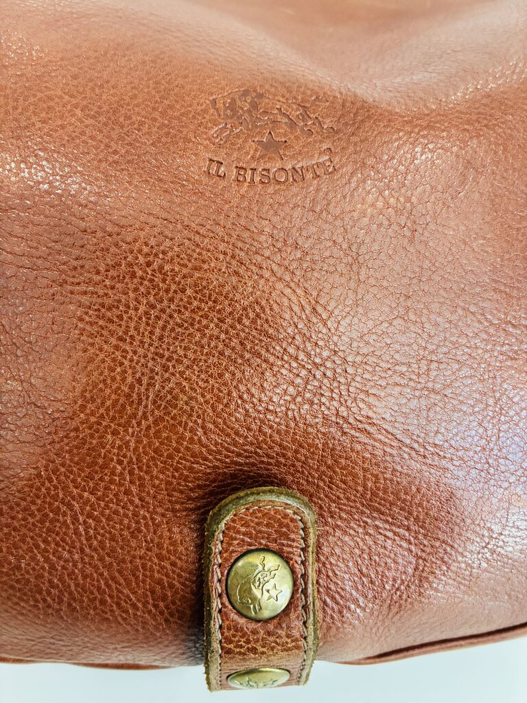 Classic and effortlessly cool, this Il Bisonte Messenger Bag is crafted from supple brown leather in a relaxed crescent-moon silhouette. The front features the brand’s signature embossed logo, along with a distinctive strap detail accented by two logo buttons at the base. The flat adjustable leather strap allows for comfortable crossbody or shoulder wear, complemented by gold-tone hardware throughout.