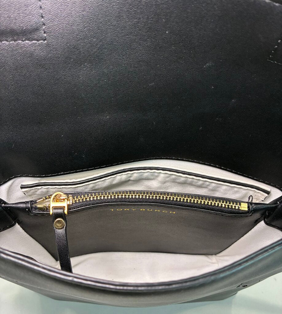 Interior: Lined With White Fabric; Divided Interior- One Zip Pocket, One Slip Pocket