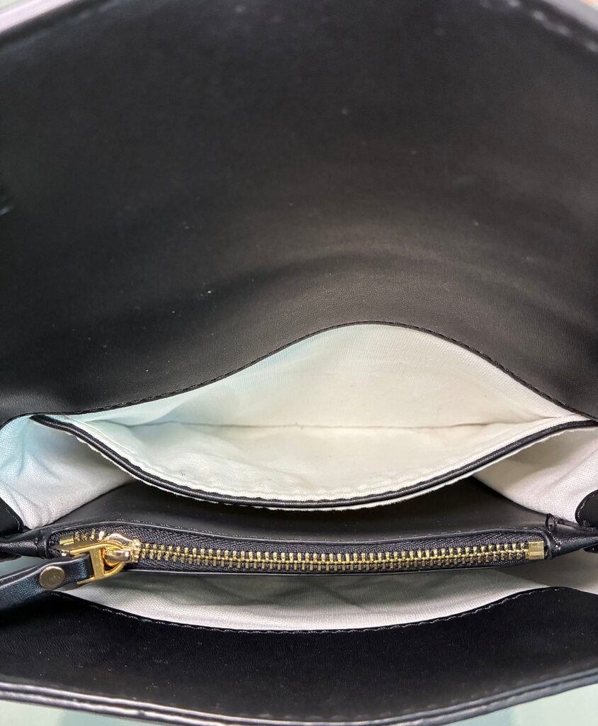 The interior is fully lined in white fabric and thoughtfully divided by a center zip compartment to keep essentials neatly organized, with an additional slip pocket for easy access to smaller items.