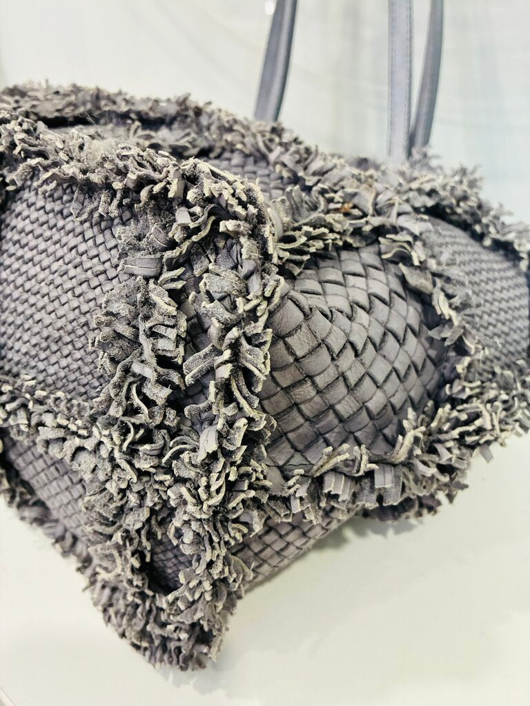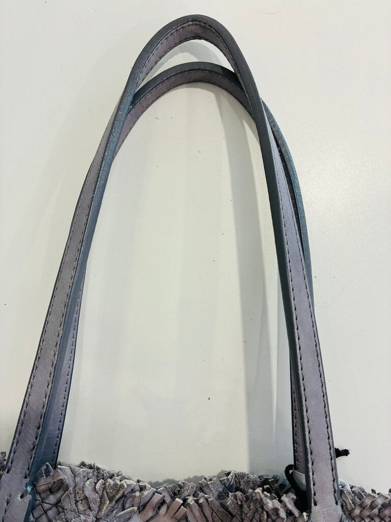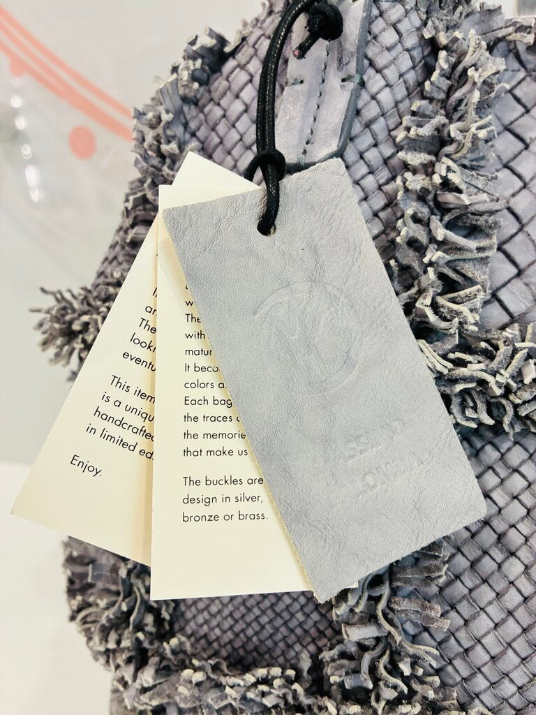 The body features an intricate interwoven leather design with delicate fringe detailing, giving it both movement and personality. Its beautiful soft-purple hue adds a sophisticated yet playful touch — refined enough for daywear, elevated enough for evening.