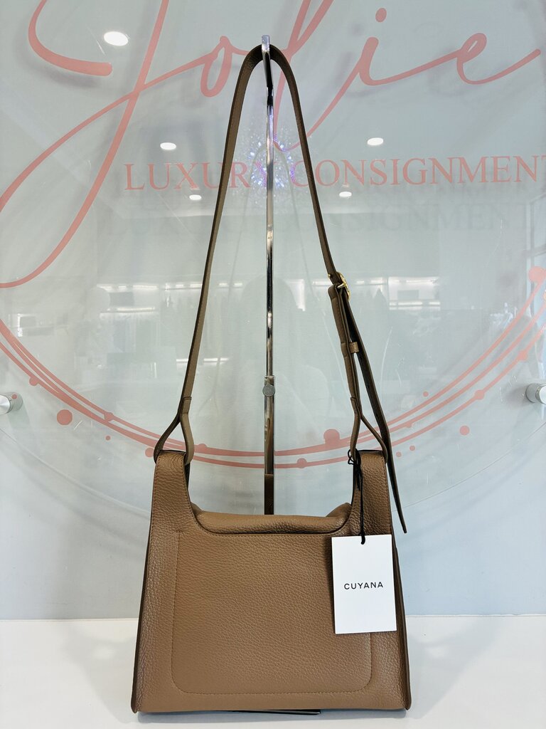 Effortlessly chic and thoughtfully designed, the Cuyana Double Loop Bag embodies the brand’s philosophy of “fewer, better” pieces. Crafted from supple pebbled leather in a warm Cappuccino hue, this bag features Cuyana’s signature double-loop handle construction and a gold-accented circular buckle on its adjustable strap, allowing it to be worn as either a shoulder or crossbody bag.