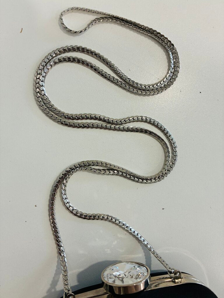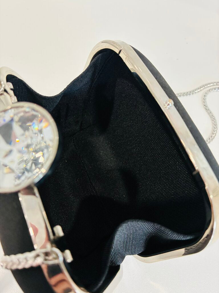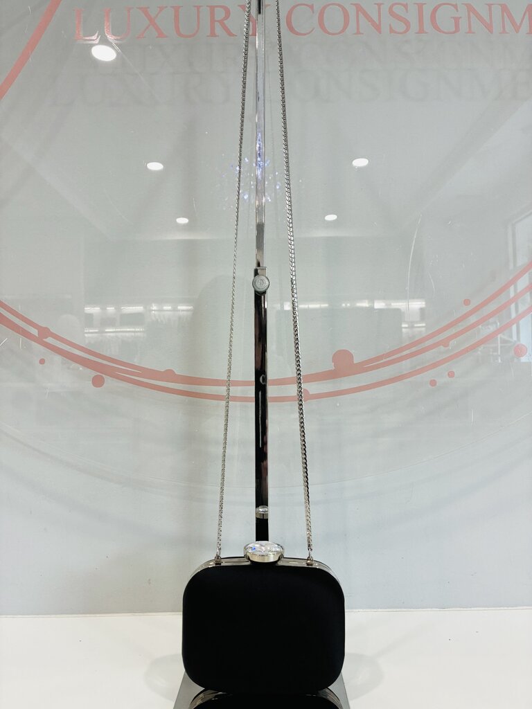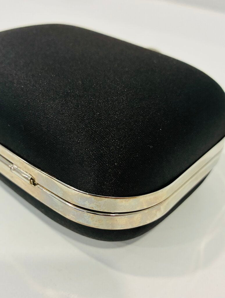 This elegant Per Se Satin Minaudière is a timeless evening accessory that captures understated glamour. The compact design features a sleek black satin base framed by silver-tone metal edges, creating a refined contrast that shines beautifully under evening light. At the top, a large faceted jewel clasp adds a touch of statement sparkle while serving as the functional snap closure. The bag includes a matching silver-tone chain strap, offering the option to wear it over the shoulder or carry it as a clutch.