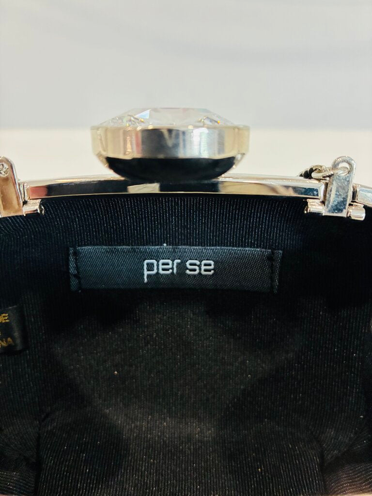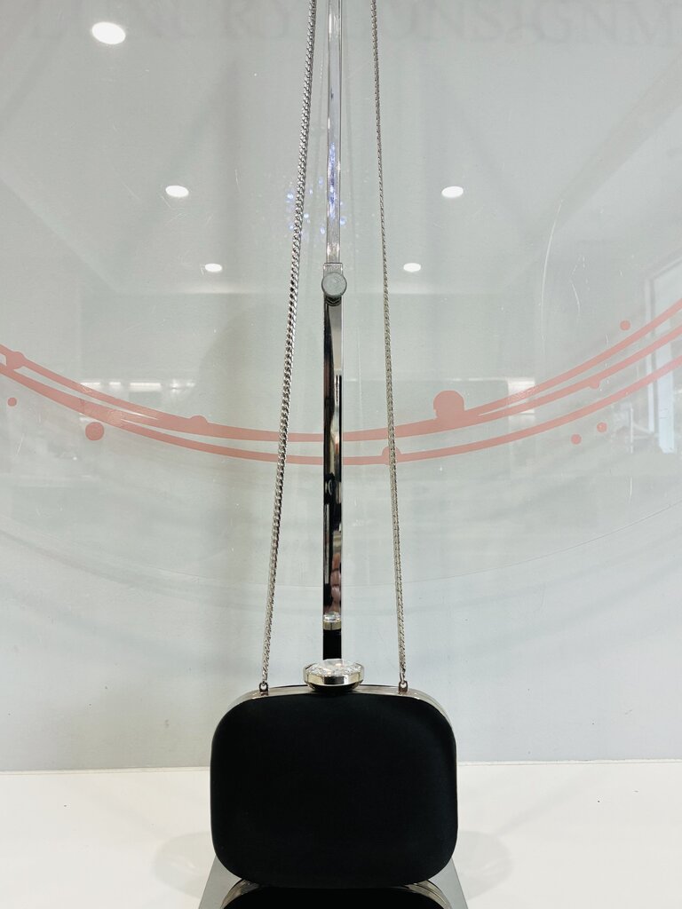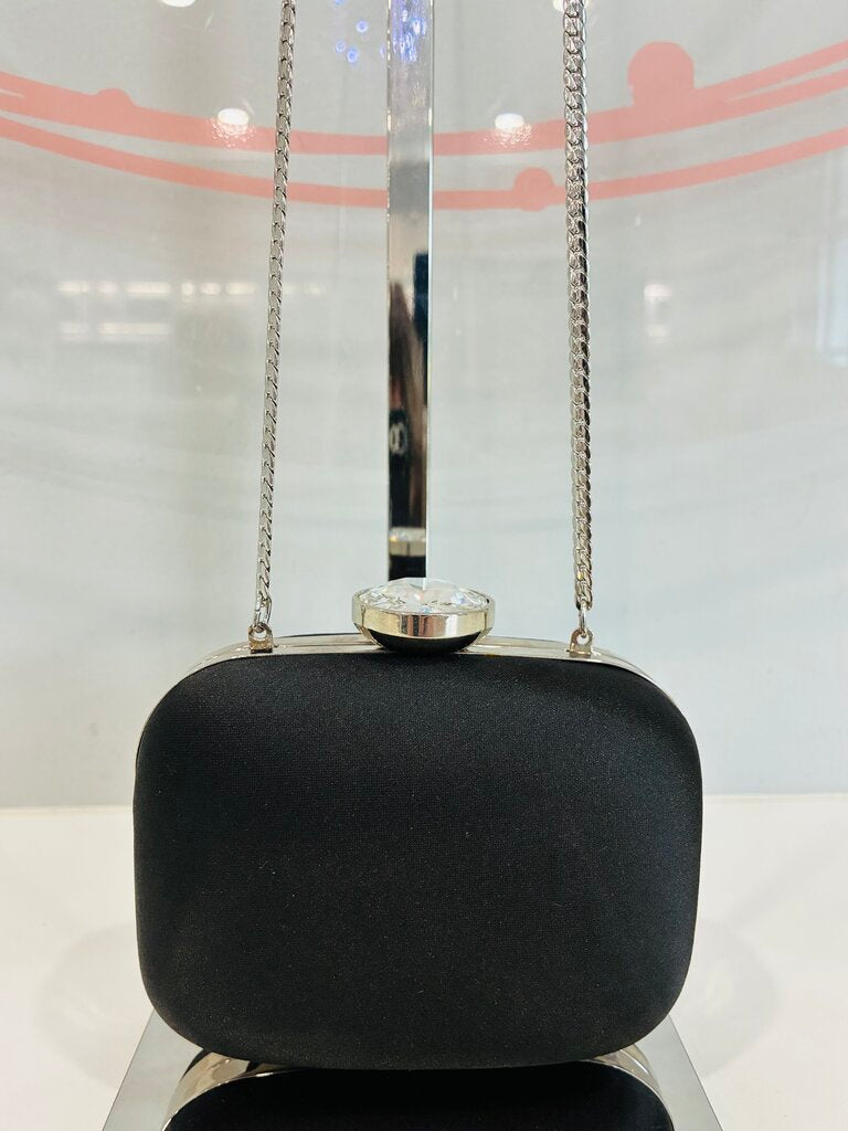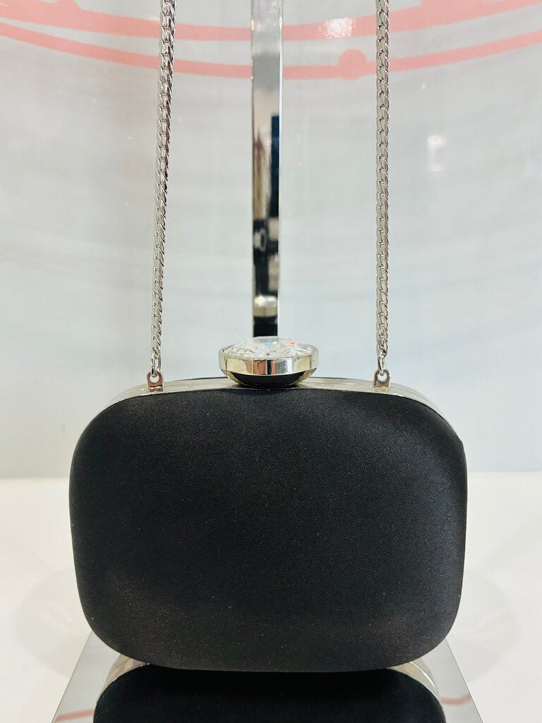 This elegant Per Se Satin Minaudière is a timeless evening accessory that captures understated glamour. The compact design features a sleek black satin base framed by silver-tone metal edges, creating a refined contrast that shines beautifully under evening light. At the top, a large faceted jewel clasp adds a touch of statement sparkle while serving as the functional snap closure. The bag includes a matching silver-tone chain strap, offering the option to wear it over the shoulder or carry it as a clutch.