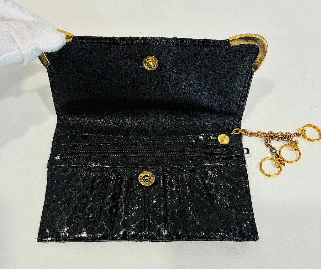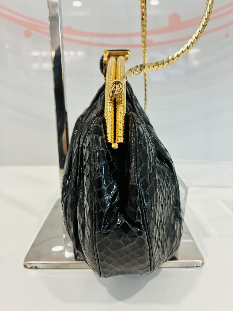 A true piece of couture history, this vintage Judith Leiber black snakeskin handbag set epitomizes timeless luxury and refined craftsmanship. Handcrafted in Italy during the 1980s, this elegant bag is composed of genuine black snakeskin with a softly pleated silhouette and gleaming gold-tone hardware.