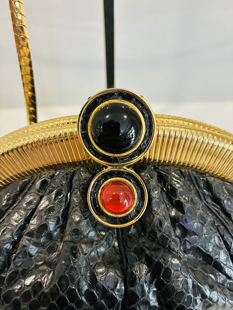 The structured frame is adorned with Judith Leiber’s signature duo cabochon clasp — one deep onyx and one rich coral — adding a striking pop of color to the classic black finish. Completing the set are two matching snakeskin accessories: a compact coin purse and a small card or key pouch, both with coordinating gold accents and chain attachments.
