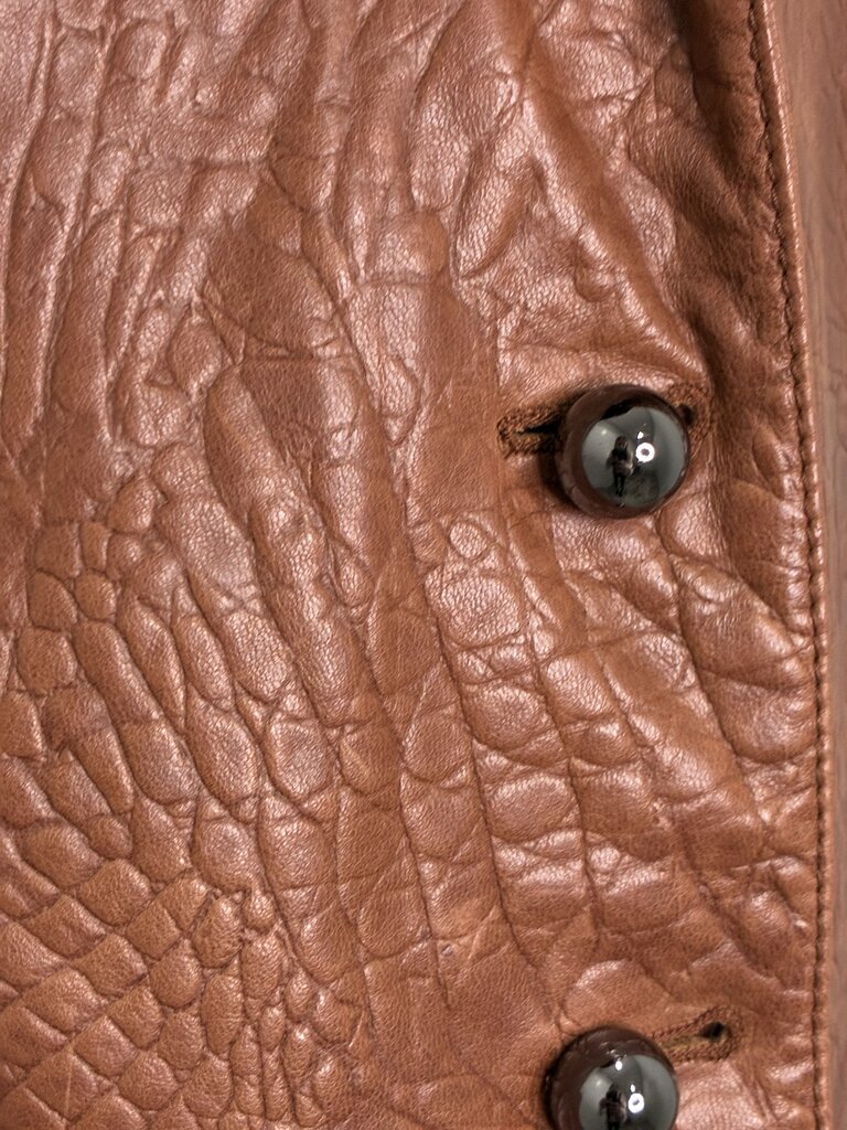 Elegant and timeless, this Armani Collezioni jacket is expertly crafted in Italy from genuine leather with a luxurious real fur collar. The leather features a subtle wrinkled-effect finish, adding depth and texture to the design. A classic button-up front with three gunmetal silver-toned buttons completes the sophisticated look, making this piece both versatile and polished.