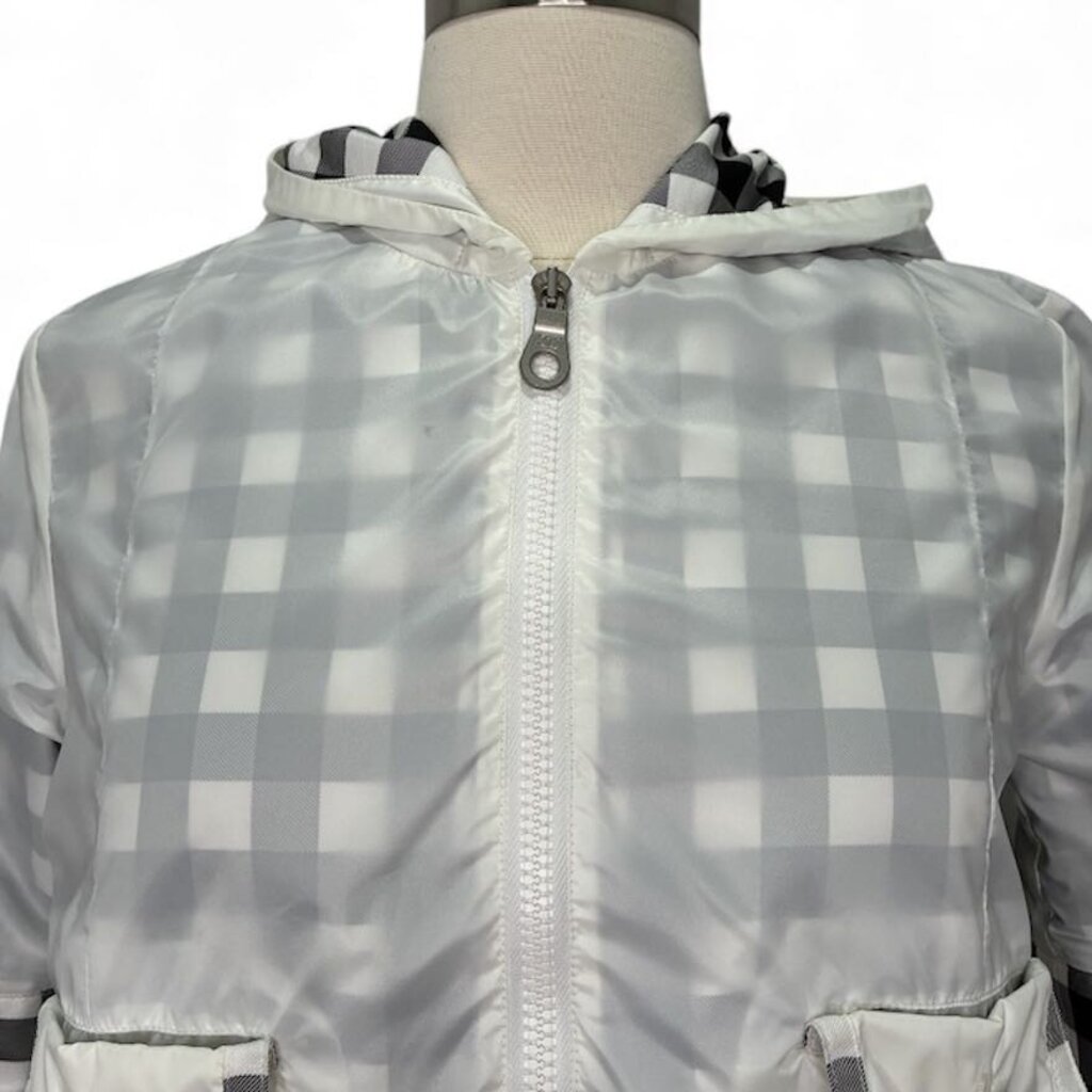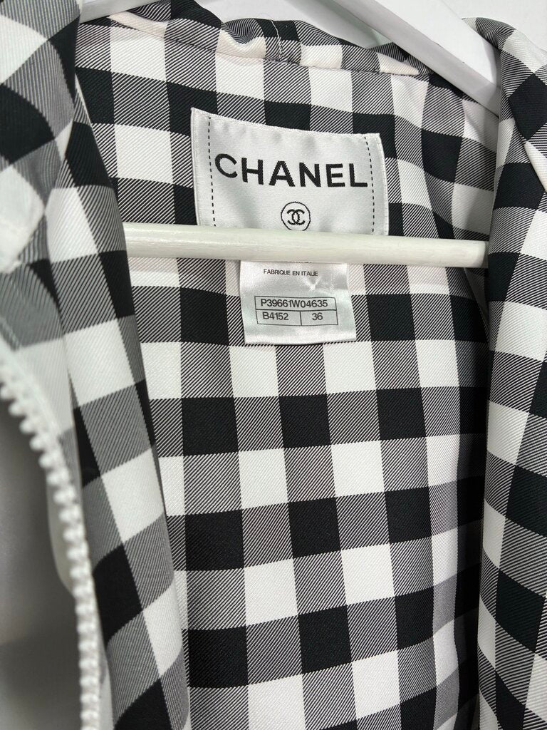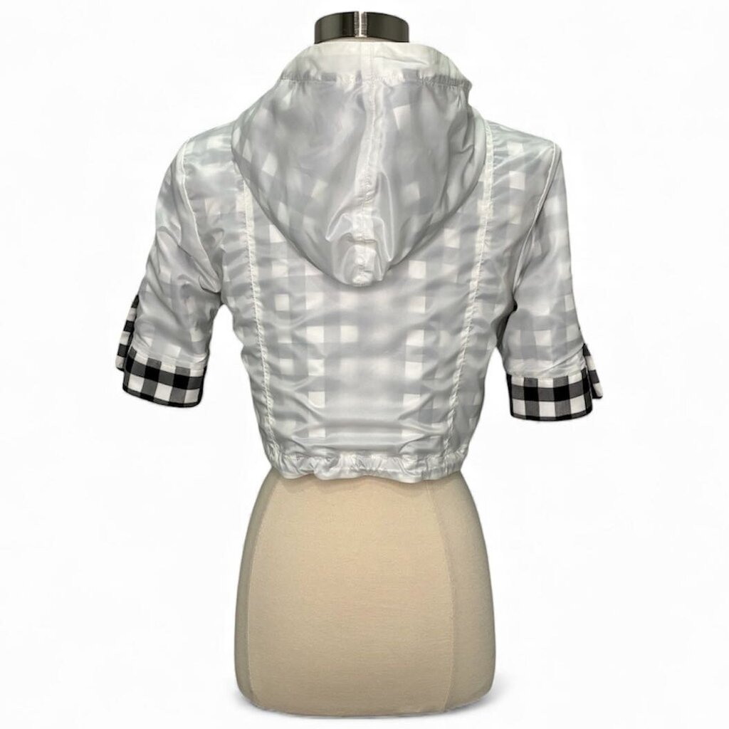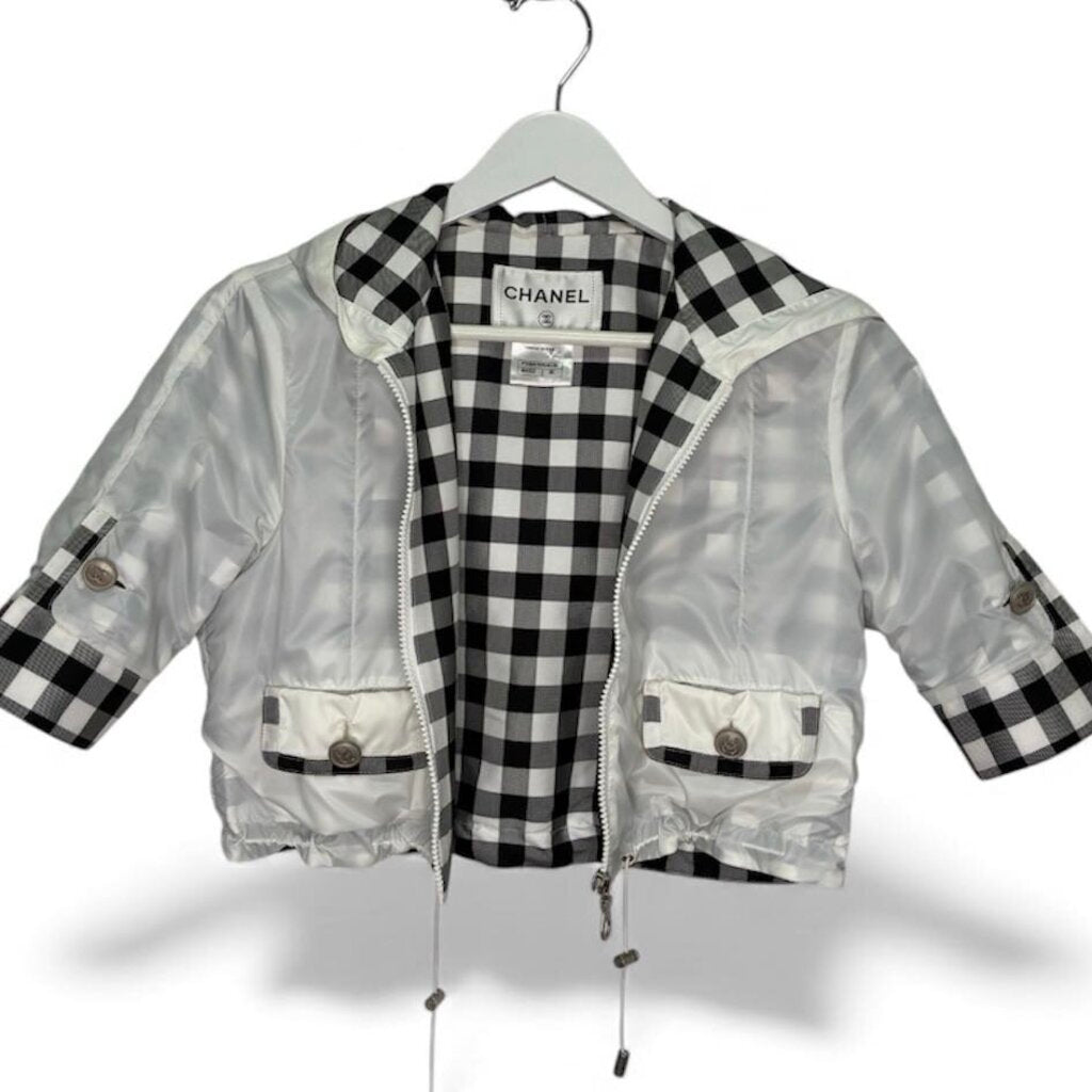 A rare, elevated sporty-chic Chanel piece. This cropped short-sleeve hooded jacket is crafted in crisp white with a black-and-white checked interior for a subtle designer contrast. The sleeves and pockets feature cuffed detailing finished with signature silver-tone CC buttons, adding that unmistakable Chanel touch.