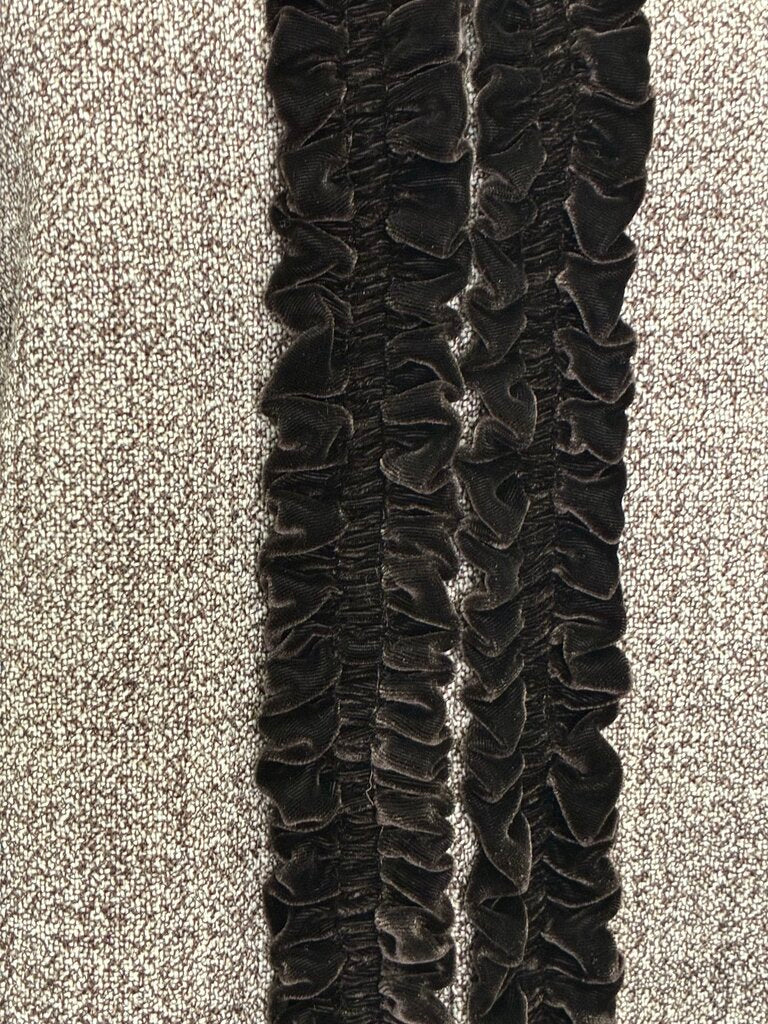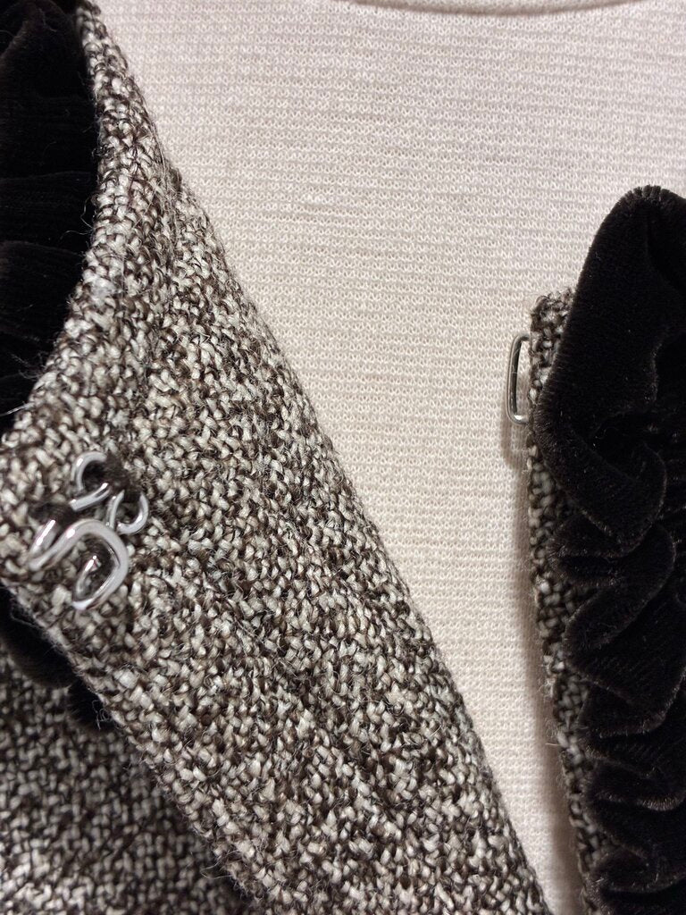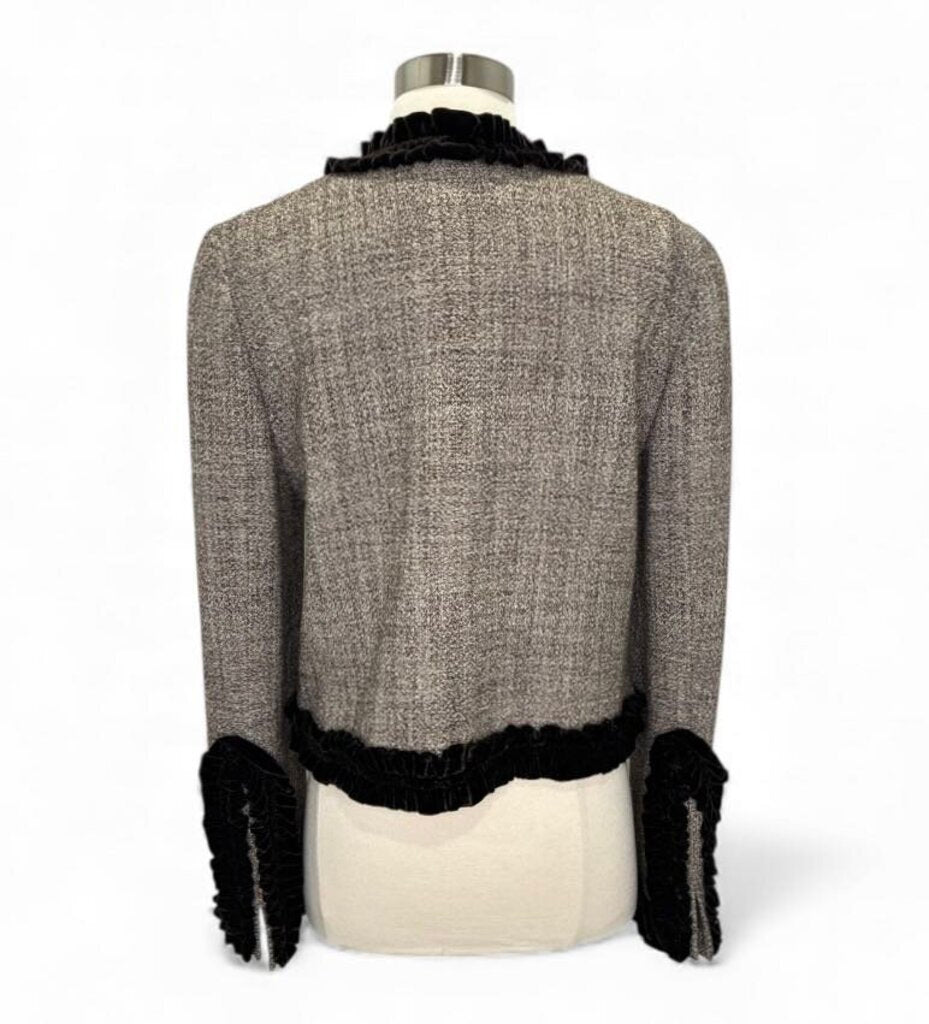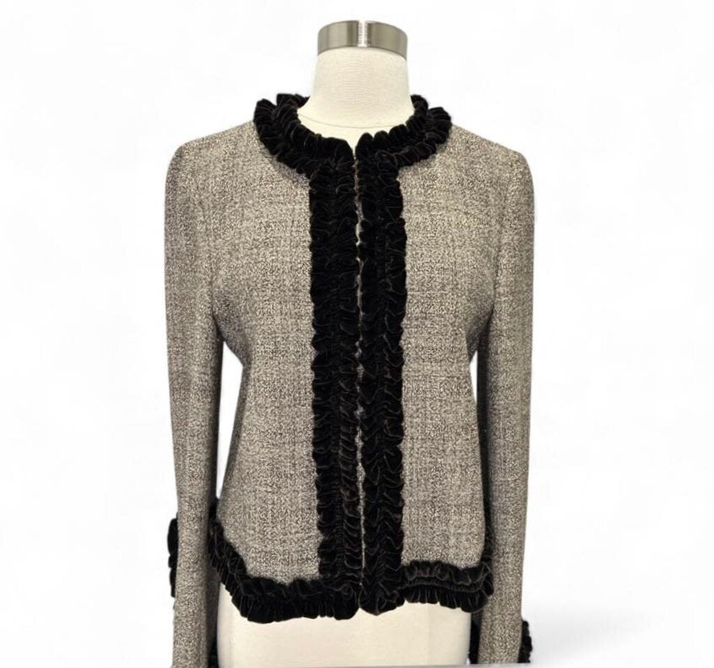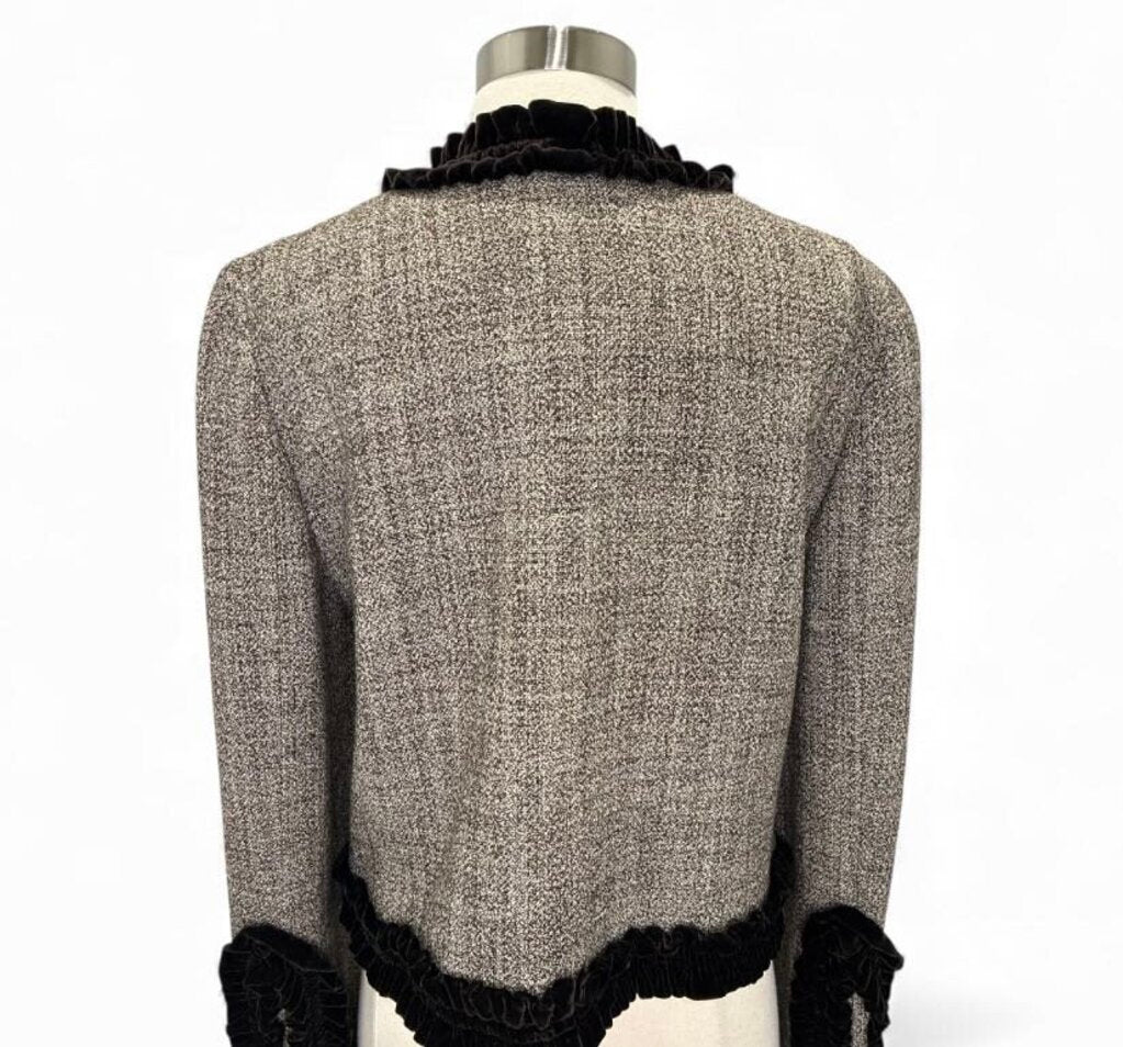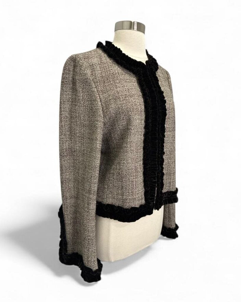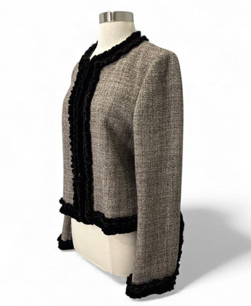 A refined blend of classic tailoring and feminine detail, this Tory Burch Tweed Velvet Trim Collarless Jacket is a timeless statement piece crafted with luxurious texture and rich tones. Made from a premium tweed fabric woven with light, medium, and dark browns, it’s elevated by dark brown velvet trim along the neckline, front edges, and cuffs, finished with delicate ruffled accents.