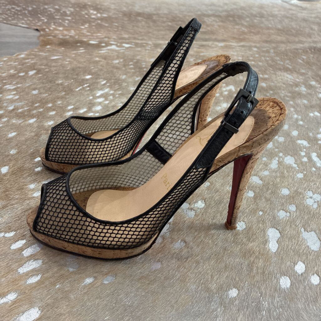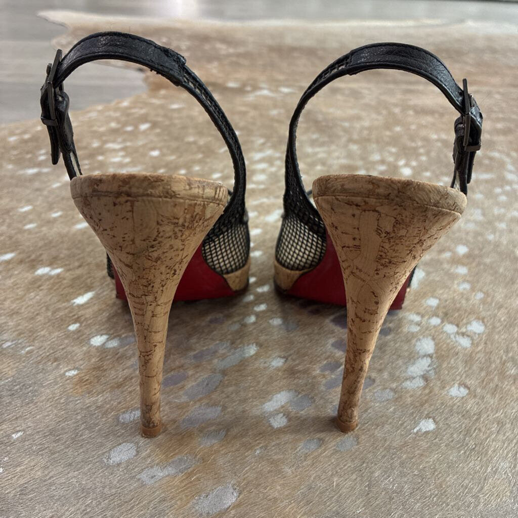 Black leather Christian Louboutin Mademoiselle Marchand peep-toe pumps with clear mesh underlay, brown cork platforms and heels, and buckle closures at slingback straps.