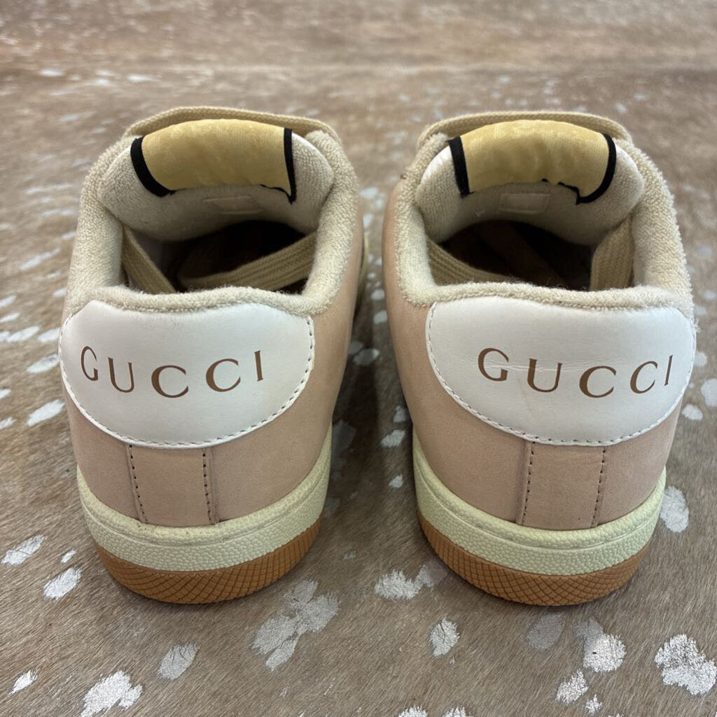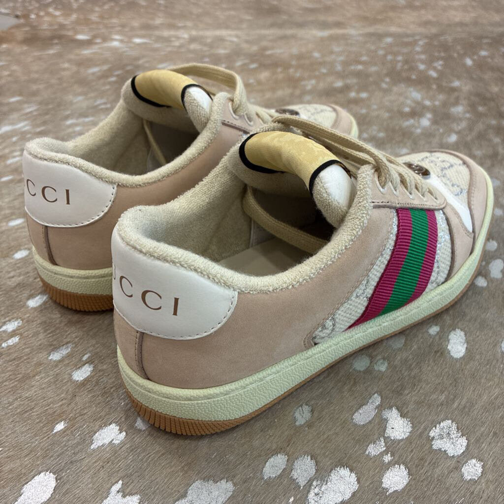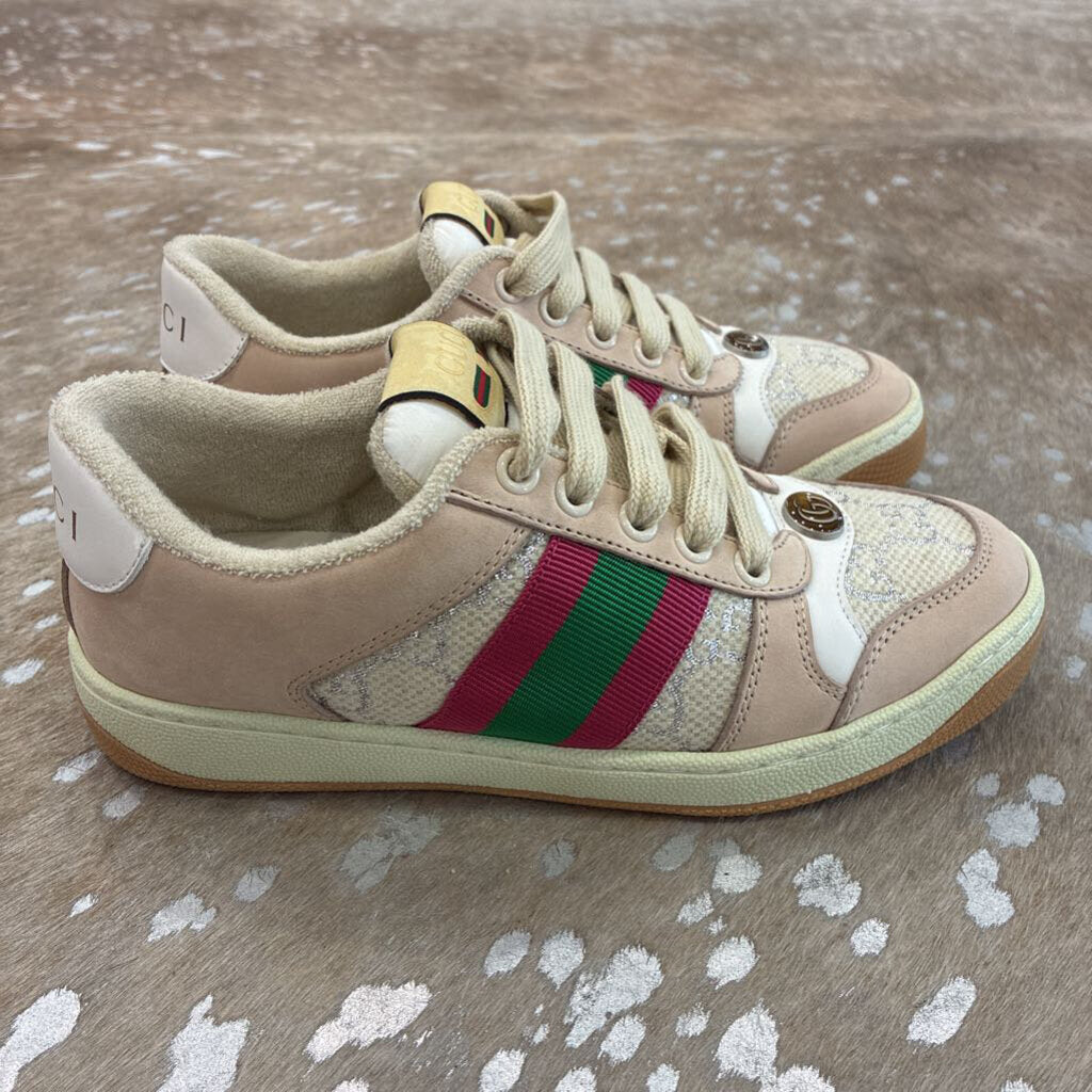 Influenced by classic sneakers from the '70s, the Screener sneakers—named for the defensive sports move—feature the Web stripe on the side and vintage Gucci logo, treated for an allover distressed effect. A pastiche of different influences that span across decades, the Pre-Fall 2019 collection continues to reference old school shapes and materials inspired by vintage sportswear.