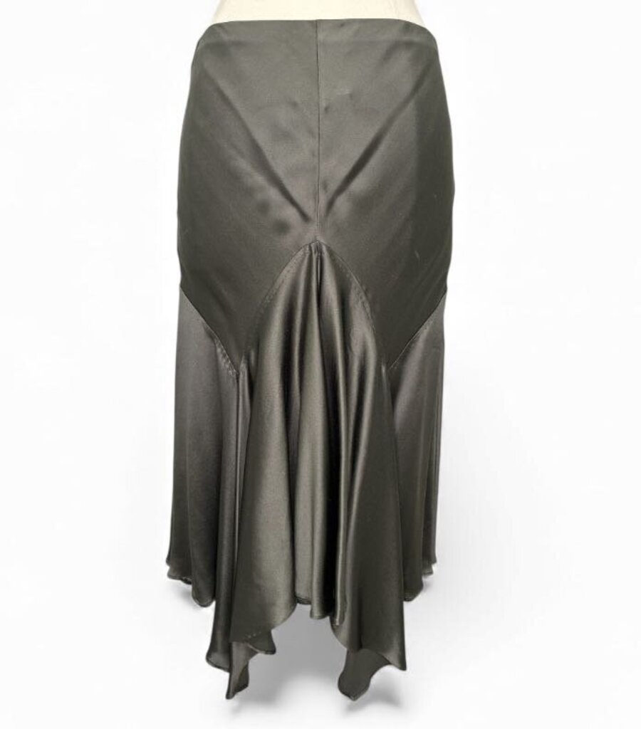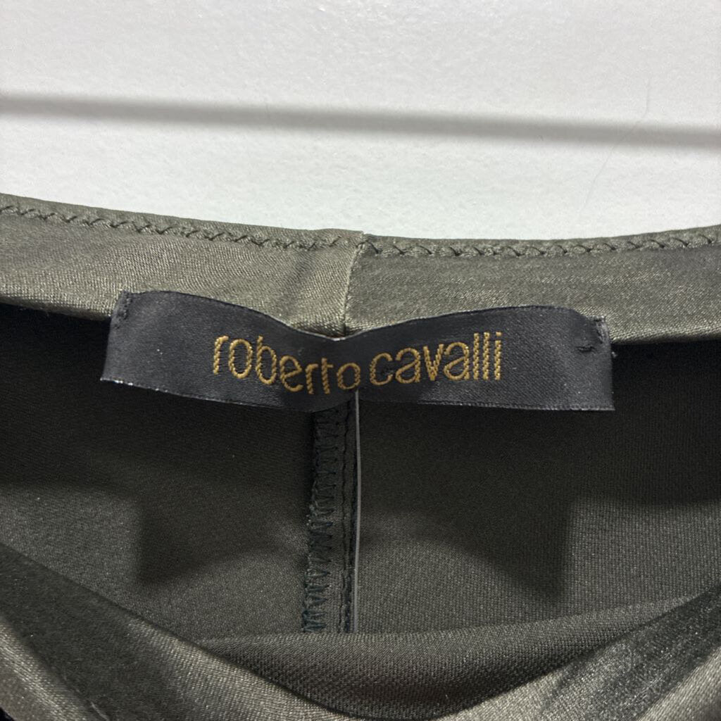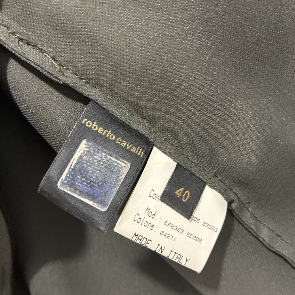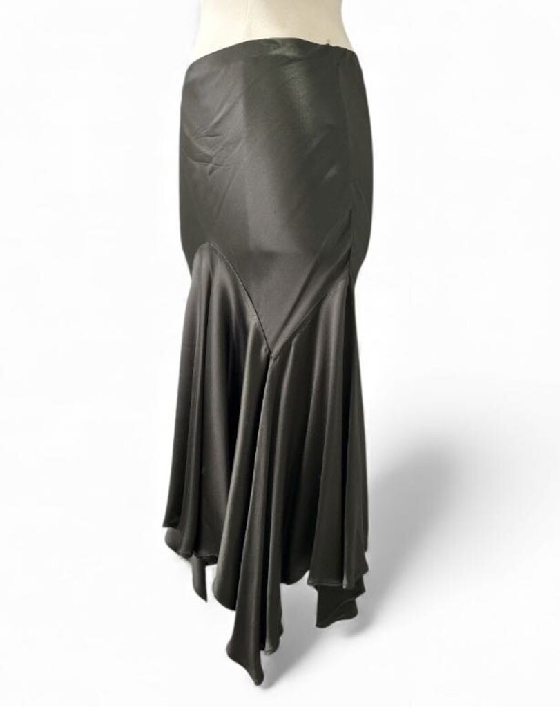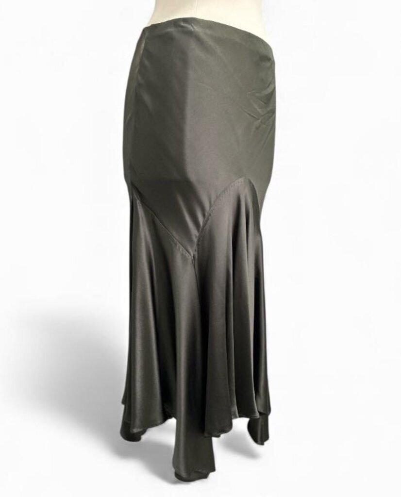 A sleek and timeless archival piece, this Roberto Cavalli midi skirt dates to the 2005 collection and exemplifies the brand’s signature sensual elegance. Crafted in Italy from 100% silk, the skirt is rendered in a rich olive green hue with a fluid, luxurious drape.