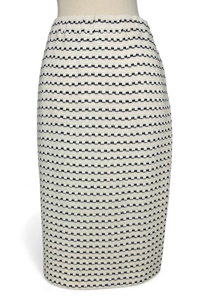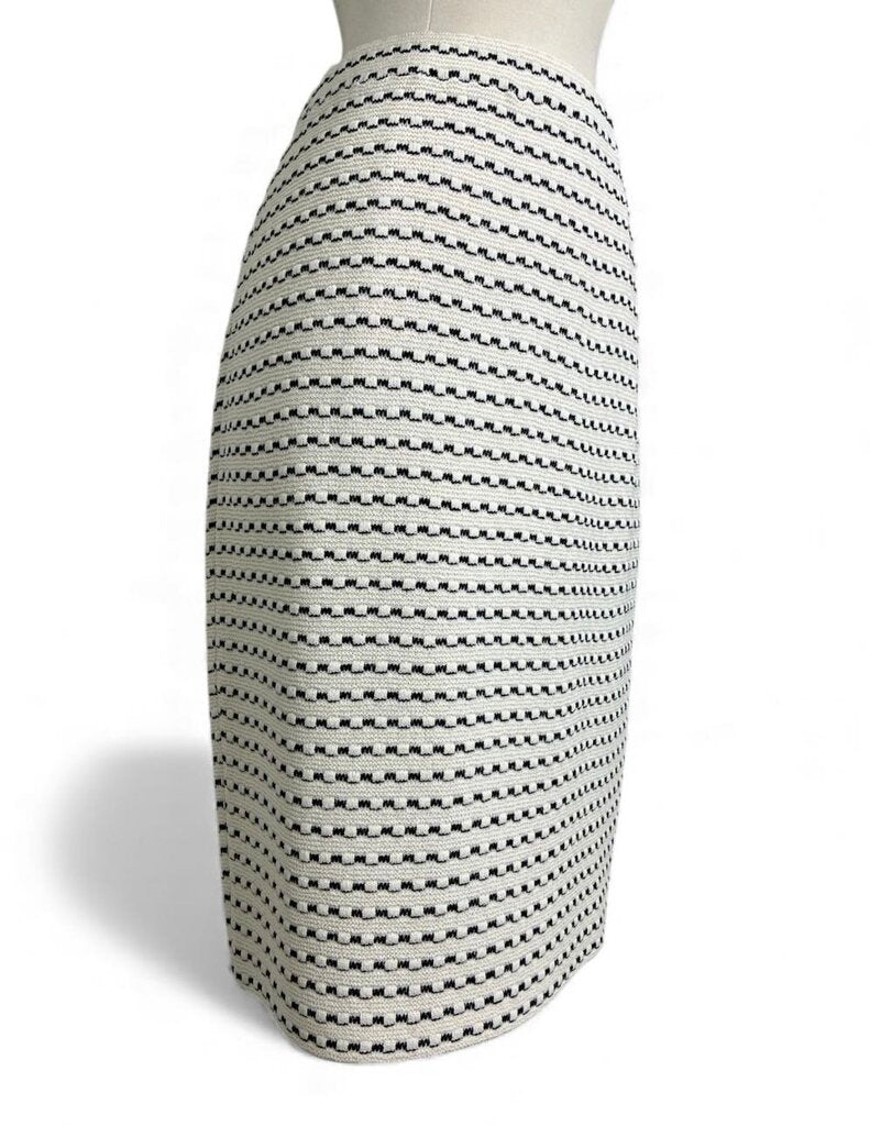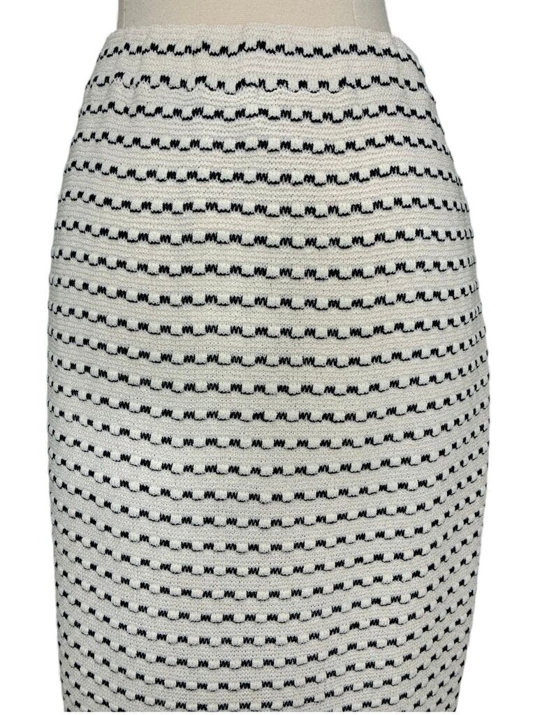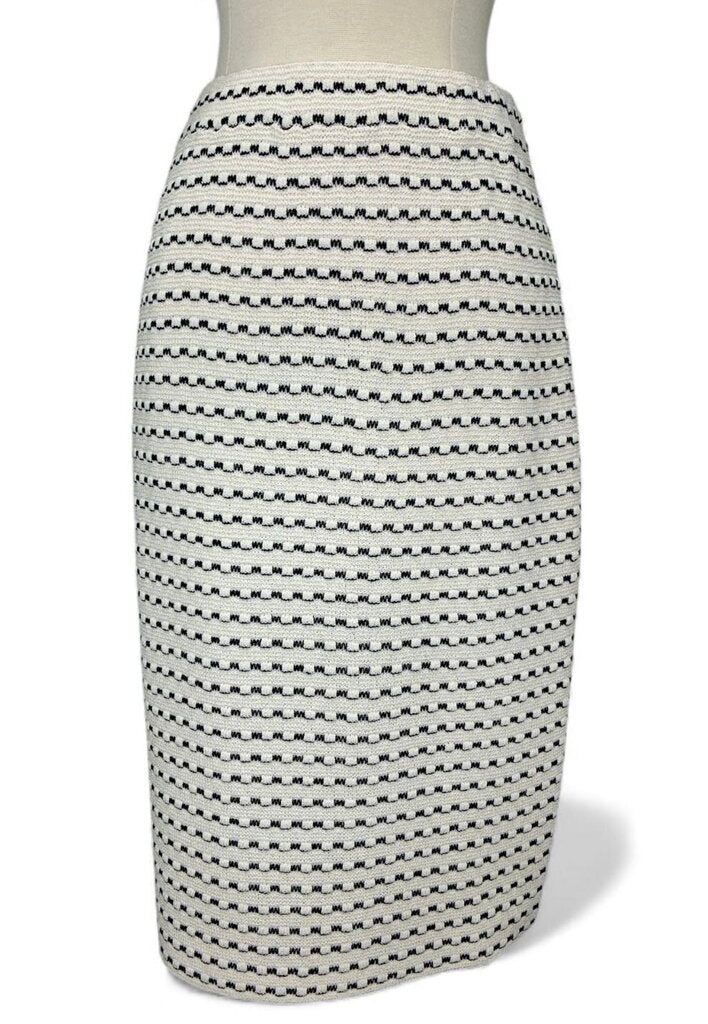 Timeless and polished, this St. John pencil skirt is a sophisticated wardrobe essential, expertly made in the USA. Designed with an elegant ecru base accented by classic black checkered detailing, this piece offers a refined yet versatile look suitable for both professional and elevated everyday wear.
