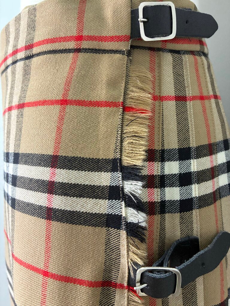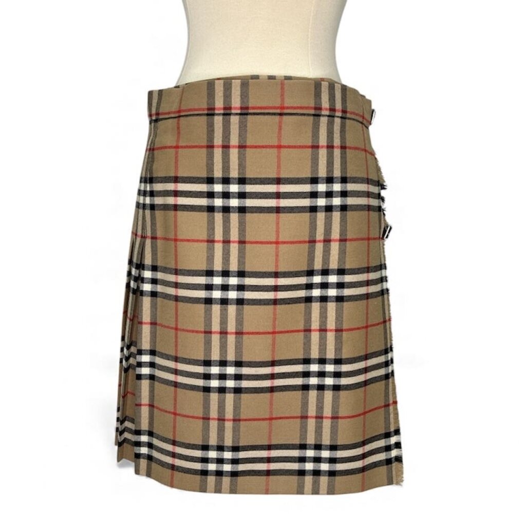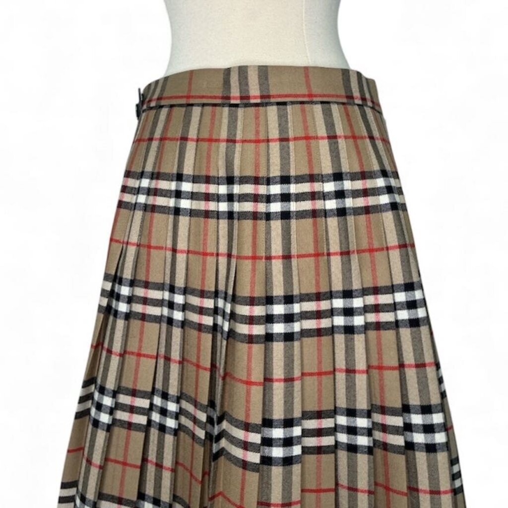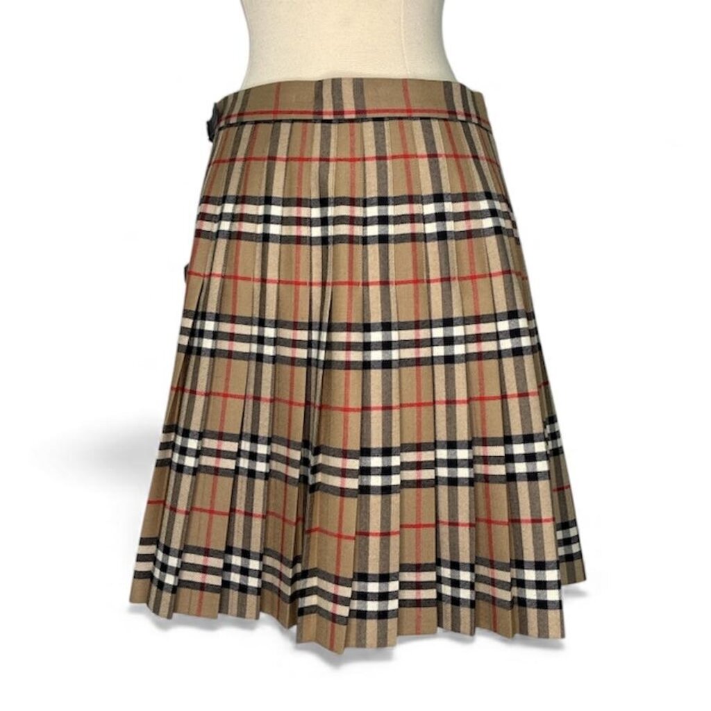 Designed with a wrap-around silhouette, the skirt features a smooth, flat front for a sleek look, while the back and sides are finely pleated, creating beautiful movement and structure. It secures first with a wide Velcro closure for an adjustable, customizable fit, then fastens with two leather side buckles, adding a signature touch of Burberry craftsmanship.