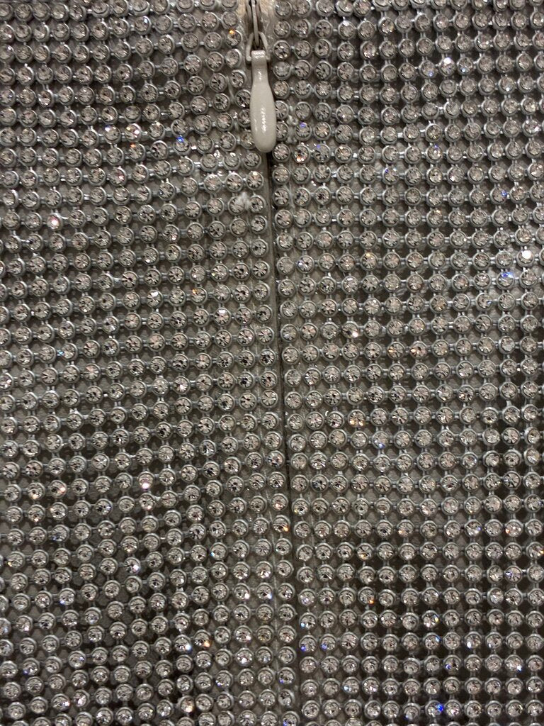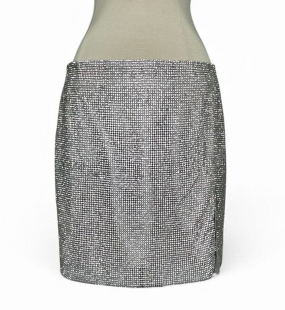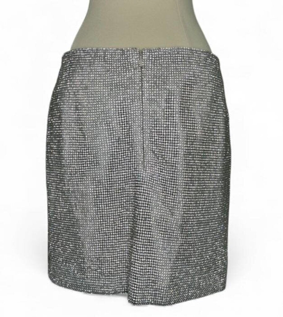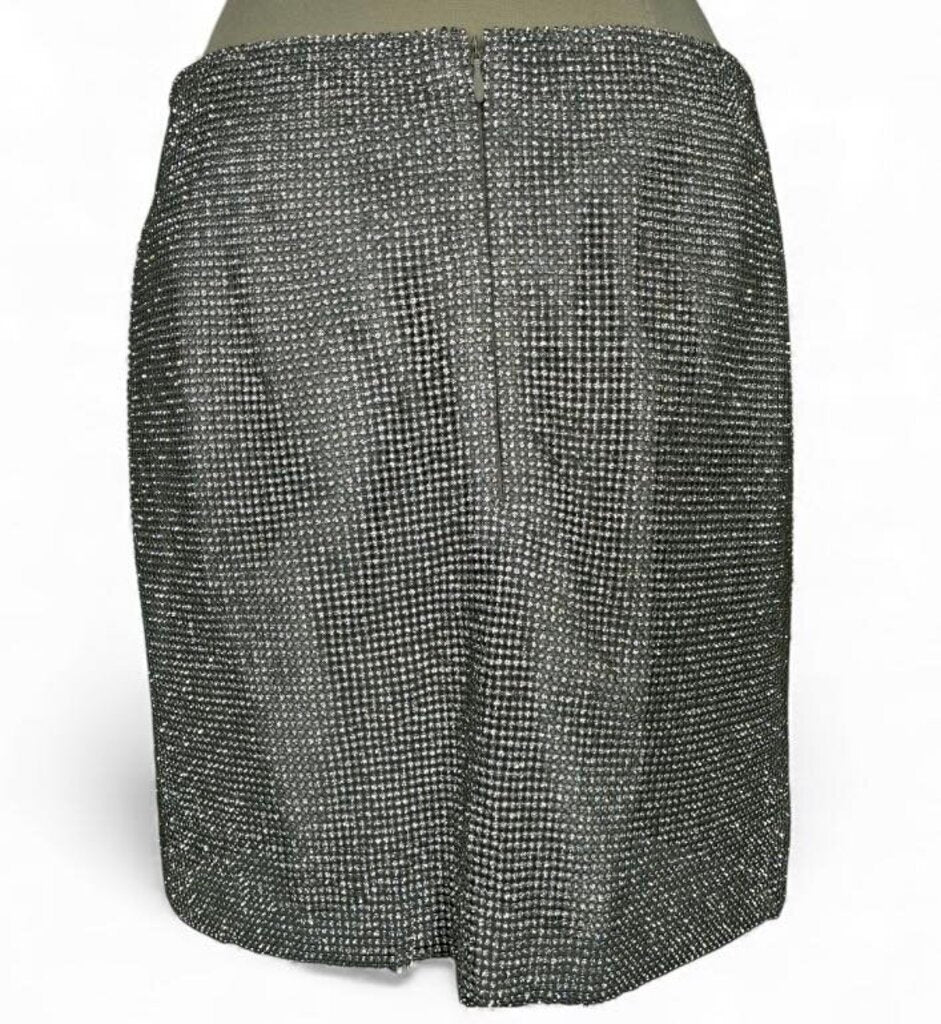 Crafted from a midweight, crystal-embellished fabric, the skirt is fully lined with a smooth faux leather–coated interior for comfort and structure. A hidden back zipper closure ensures a clean, flattering fit, making this skirt perfect for evenings, events, or standout styling moments.