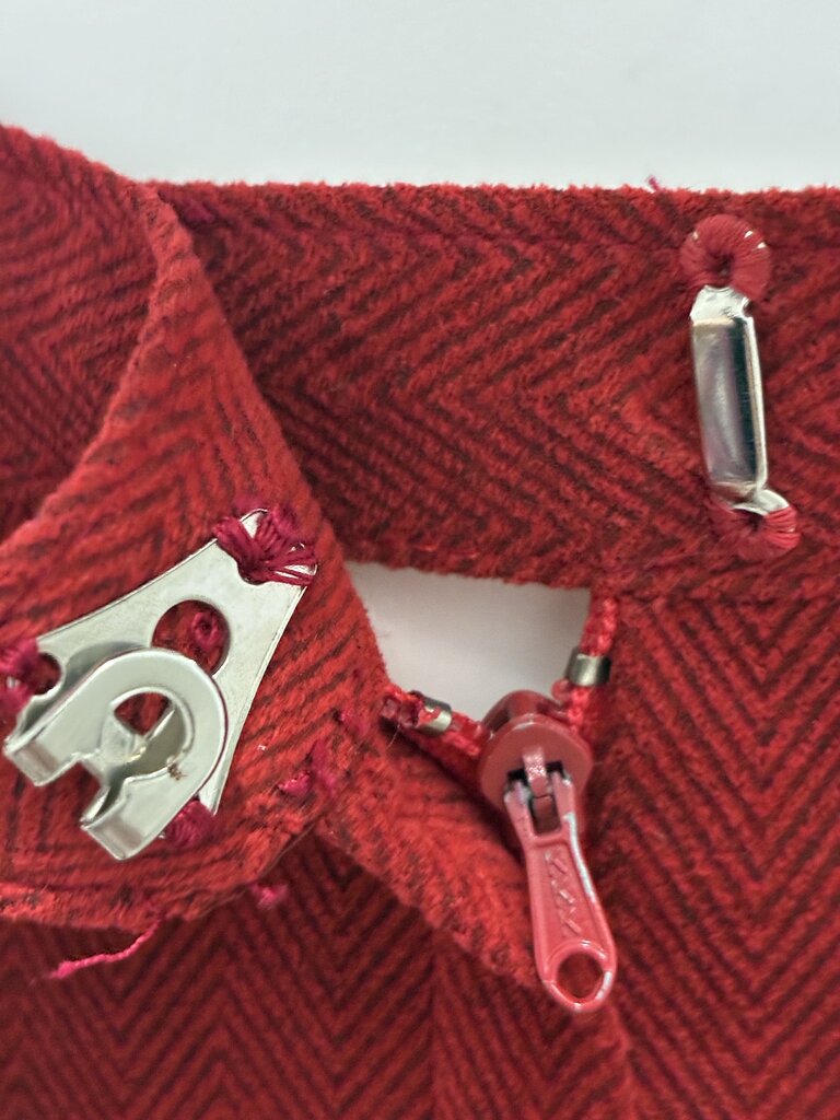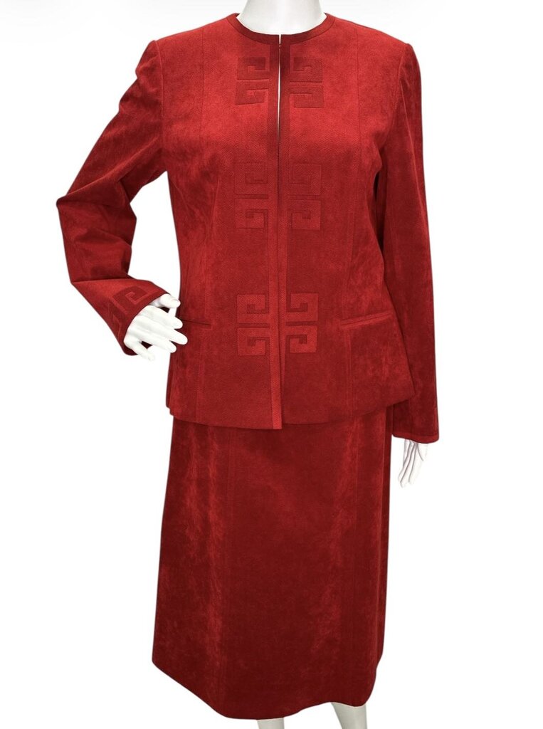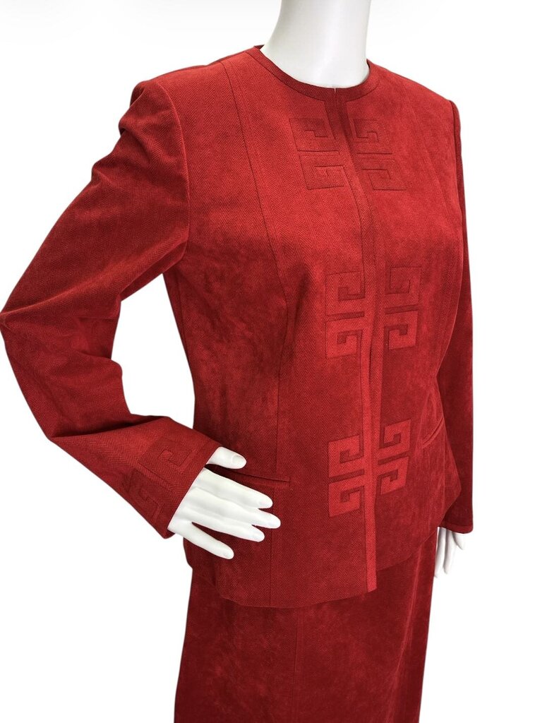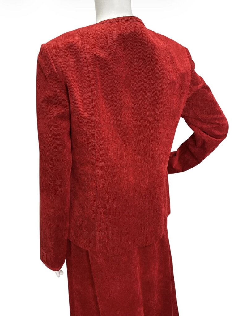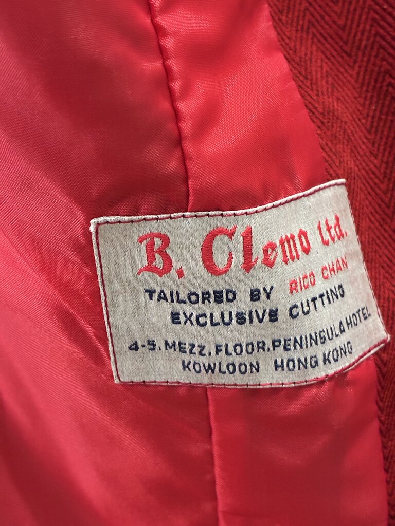 Step into vintage elegance with this B Clemo by Rico Chan two-piece set, crafted in Hong Kong in a striking red hue. The set features a sophisticated geometric design along the front of the blazer and cuffs, creating a bold yet refined statement.