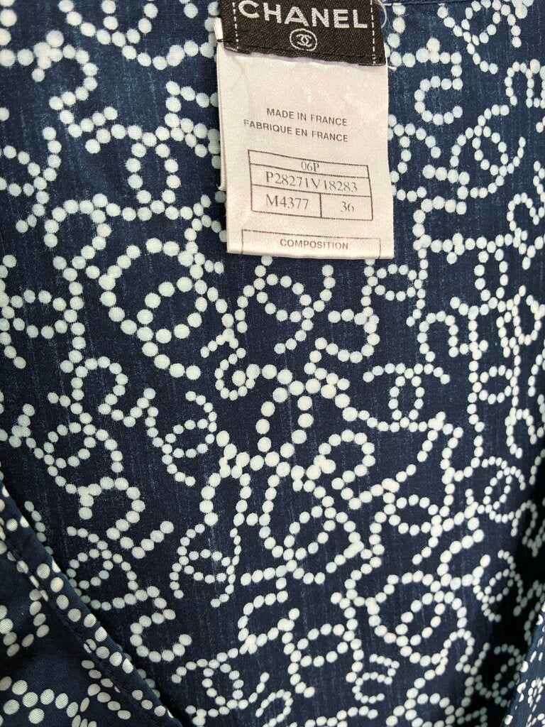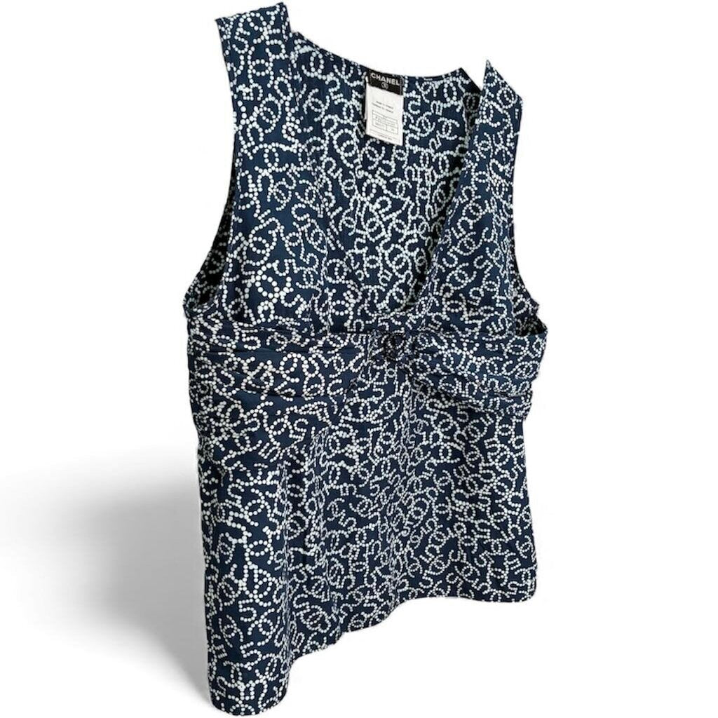 A piece from Chanel’s 2006 Spring Collection (06P). This sleeveless knit top features a navy and cream palette with bold No. 5 and interlocking CC motifs woven throughout, unmistakably Chanel and highly collectible.