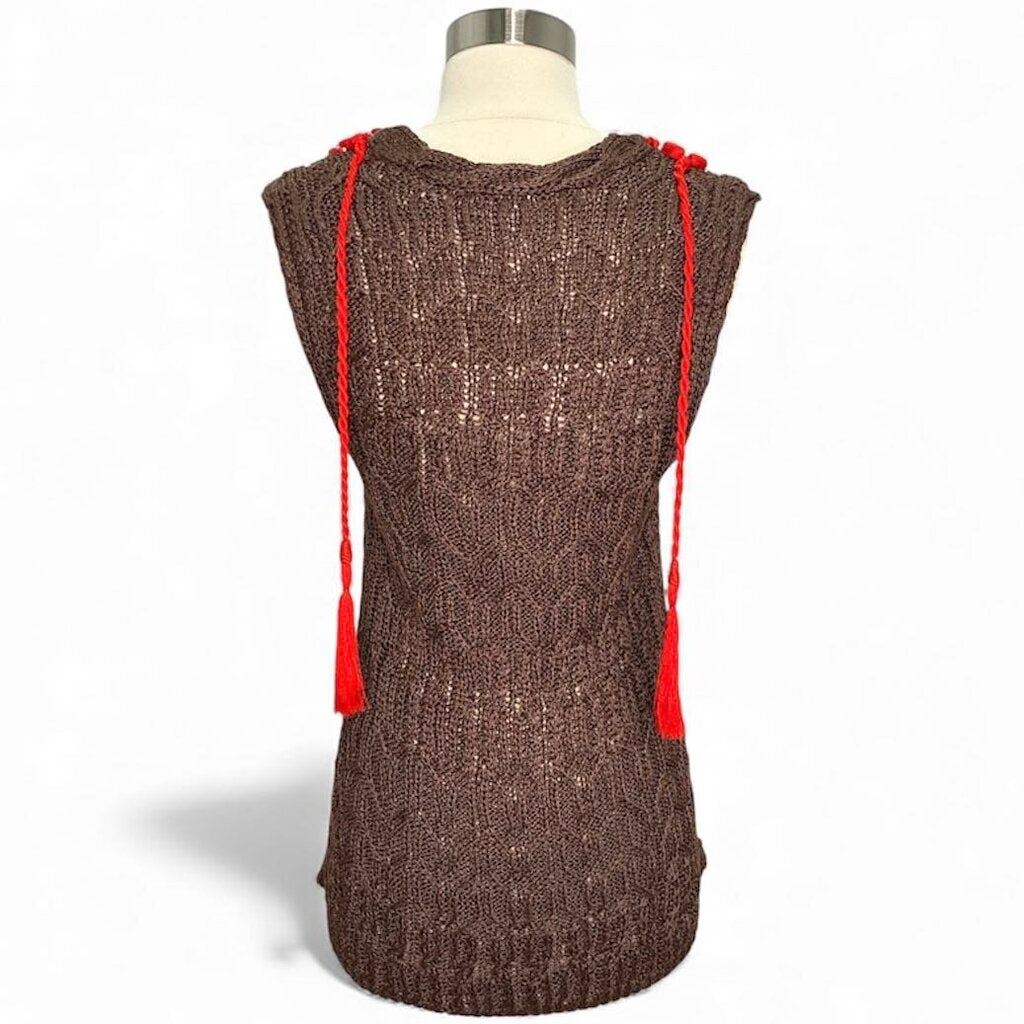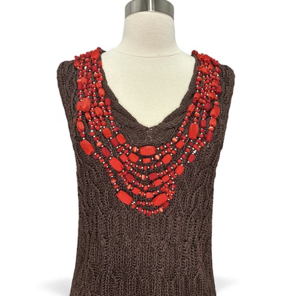Make a statement with this exquisite Oscar de la Renta Beaded Crochet Tank, crafted in Italy from a luxurious blend of 54% Linen and 46% Silk. This striking piece features a rich brown crochet knit with a beautifully slinky drape and a deep V-neckline embellished with an assortment of bold red chunky beads, adding breathtaking texture and dimension.