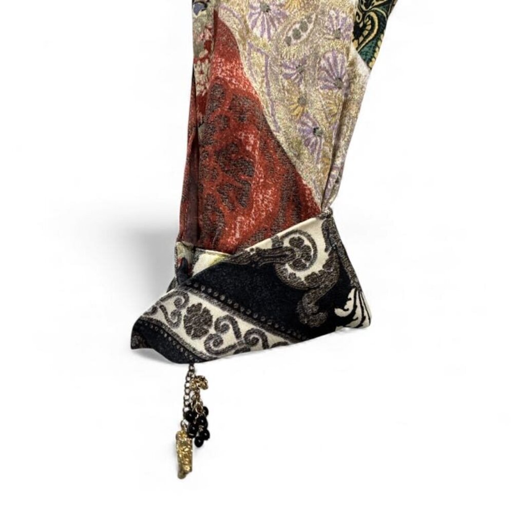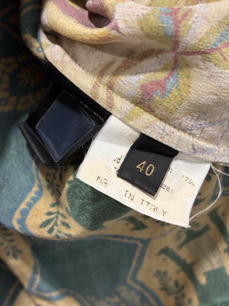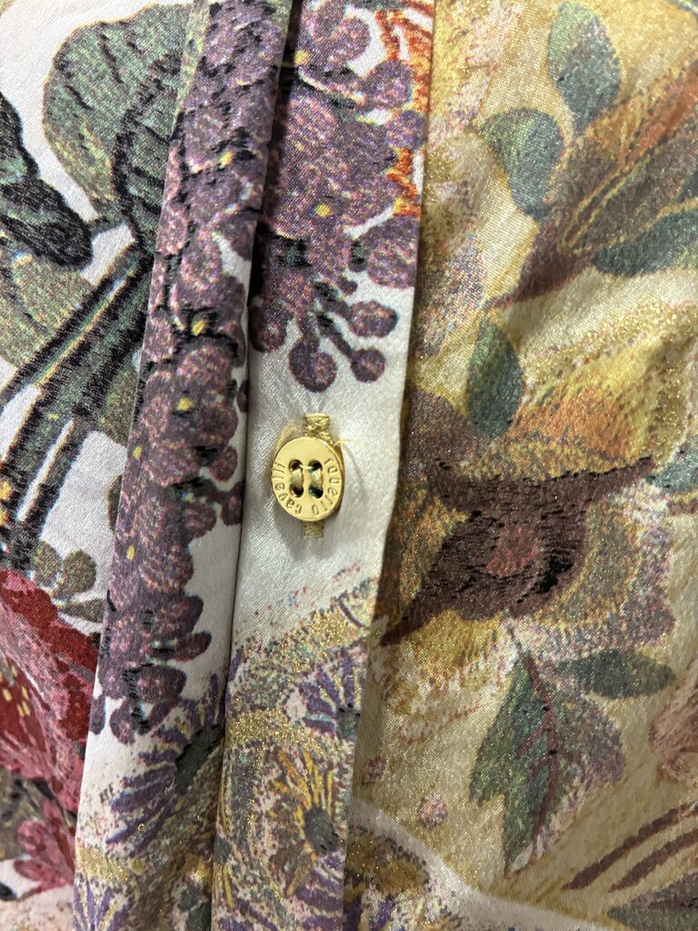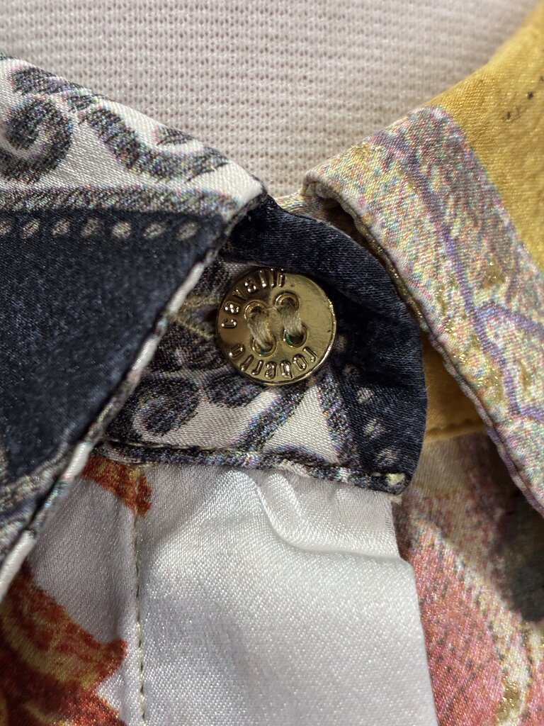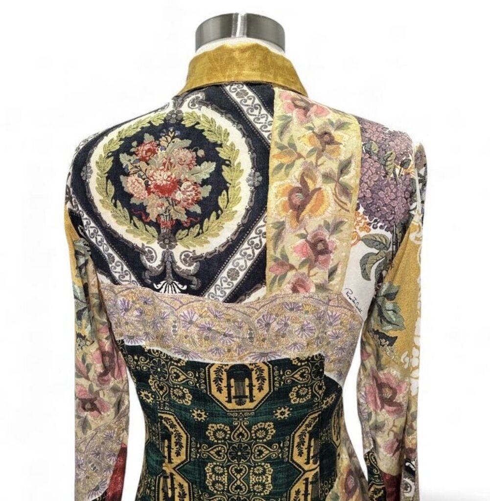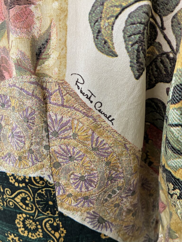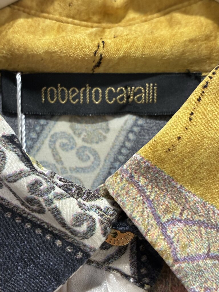 Bold and luxurious, this Roberto Cavalli silk blouse showcases the brand’s signature flair with vibrant, mixed floral patterns, some accented with subtle sparkle. The design features a pointed collar, hidden button-front closure, and decorative dangling hardware at the sleeve cuffs. The Cavalli name is artfully integrated throughout the pattern, adding a distinct designer touch.
