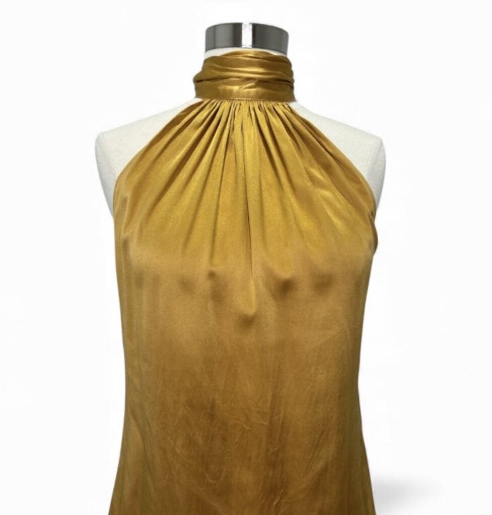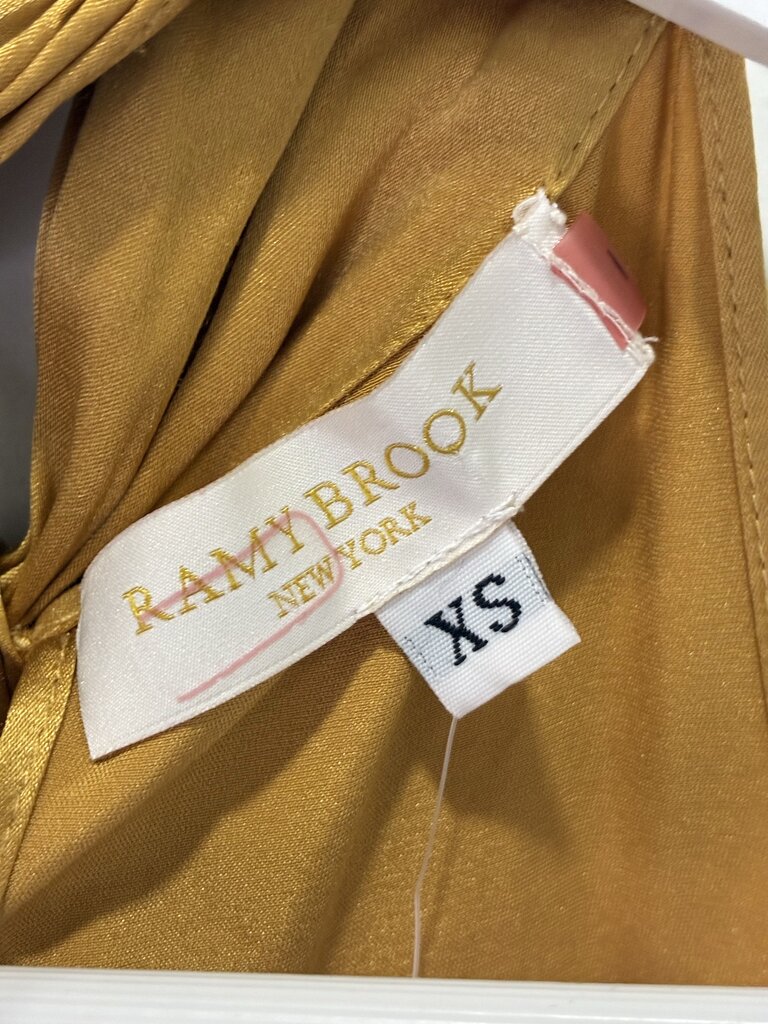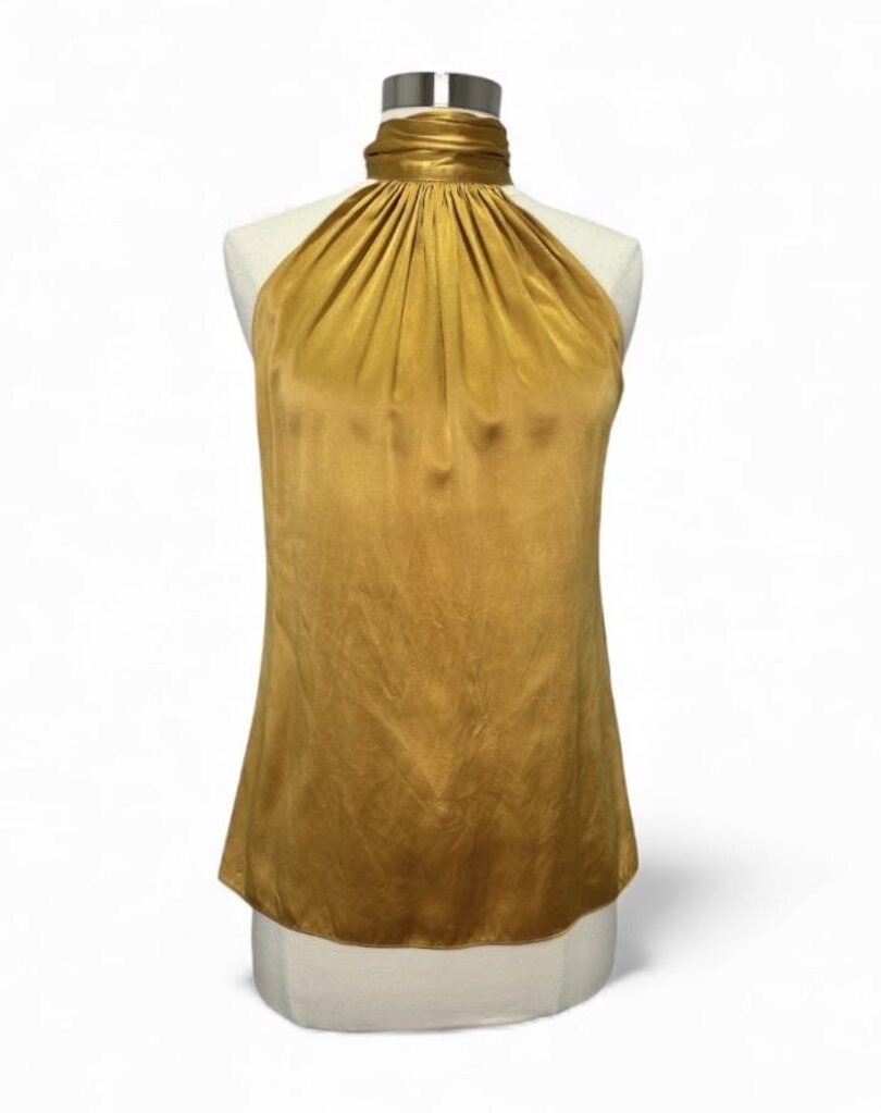 Elegant and effortlessly chic, the Ramy Brook Lori halter top is crafted from a luxurious silk-stretch blend that drapes beautifully on the body. Designed in a radiant gold hue, this piece features a high halter neckline with a delicate ribbon tie at the back, offering a flattering and adjustable fit.