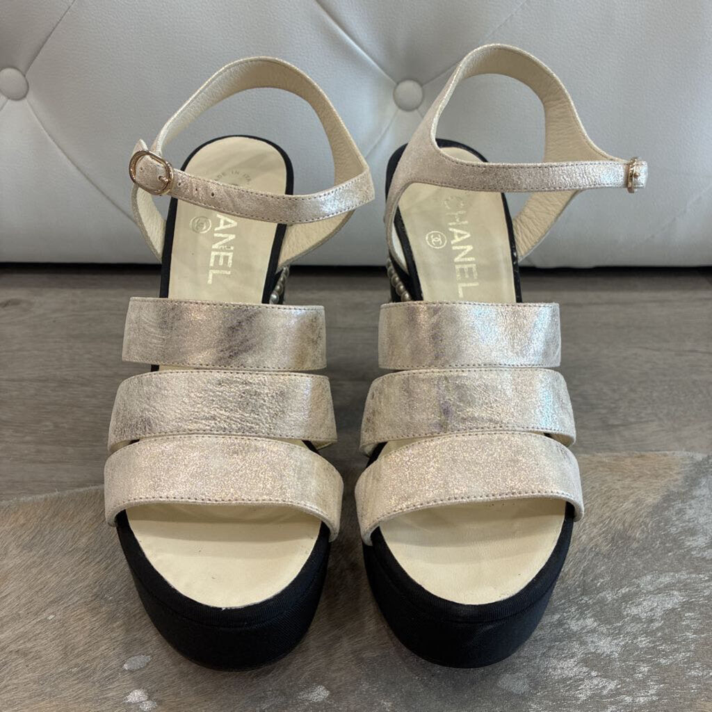 Chanel Crumpled Calfskin & Grosgrain Pearl Wedge Sandals – Size 40