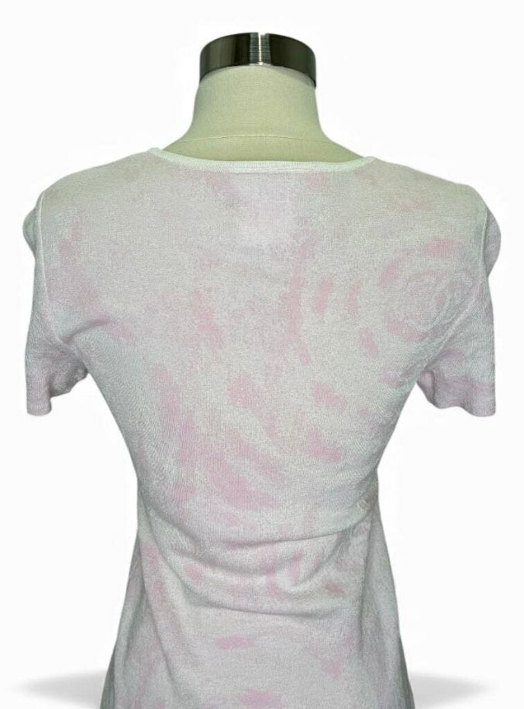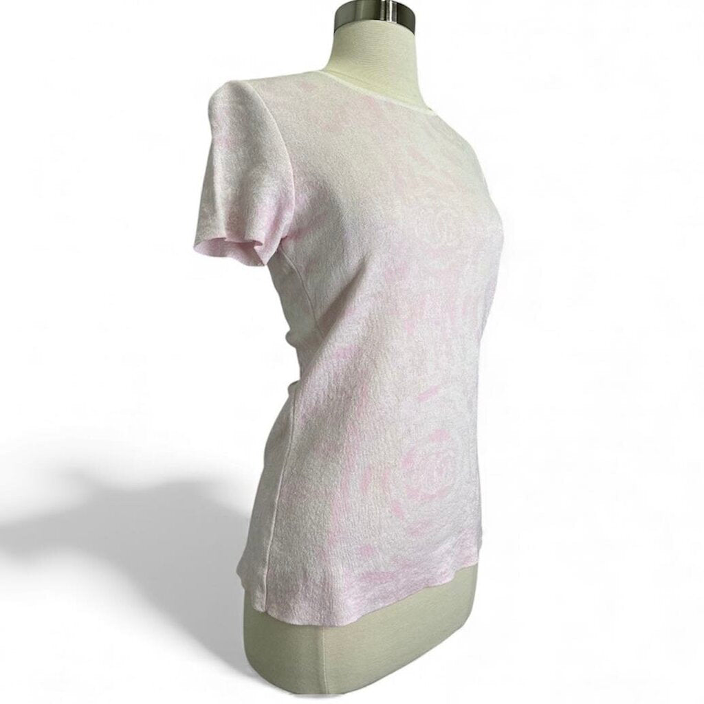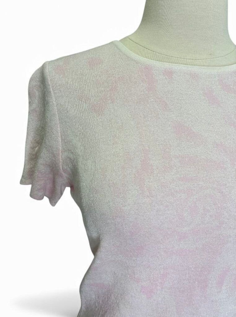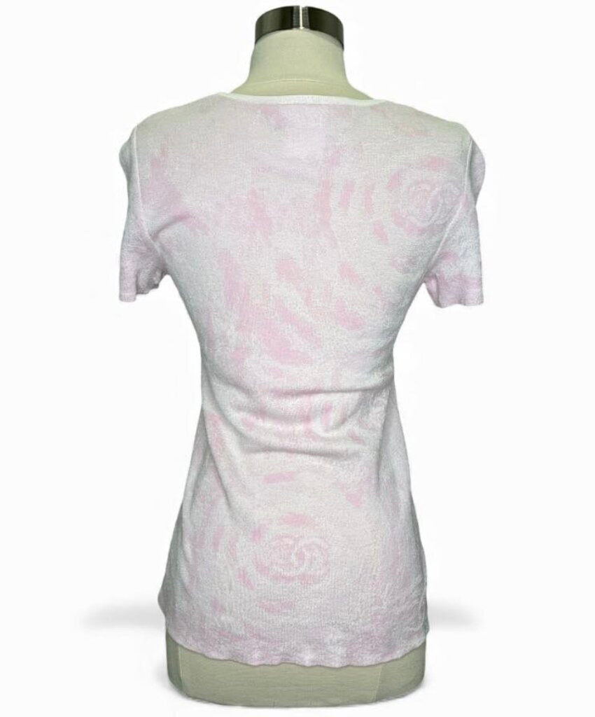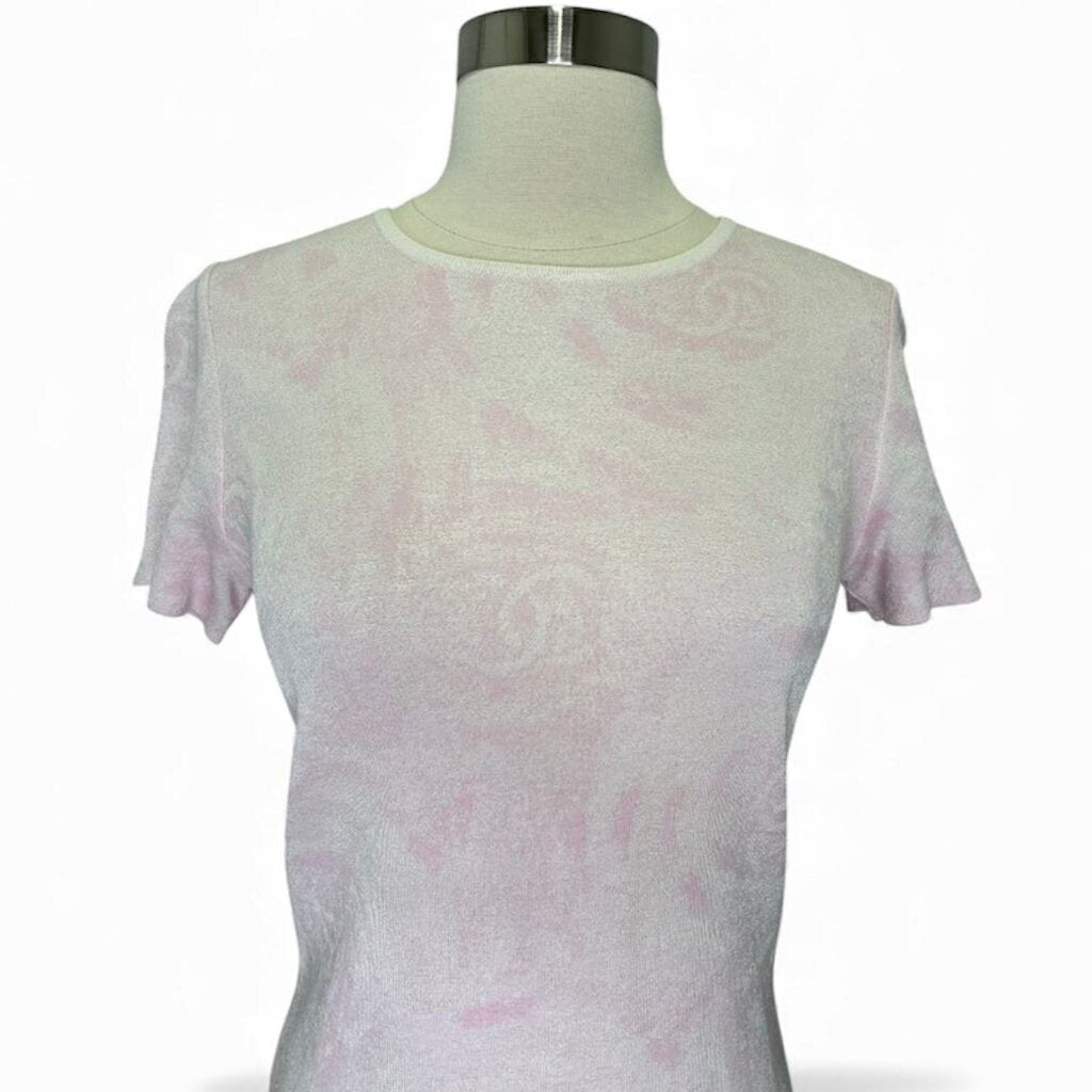 A charming piece from Chanel’s 09C Collection, this vintage knit T-shirt features a delicate rose pink and white roses print, radiating feminine elegance and timeless style. Crafted with soft, breathable fabric, it offers both comfort and a flattering fit.